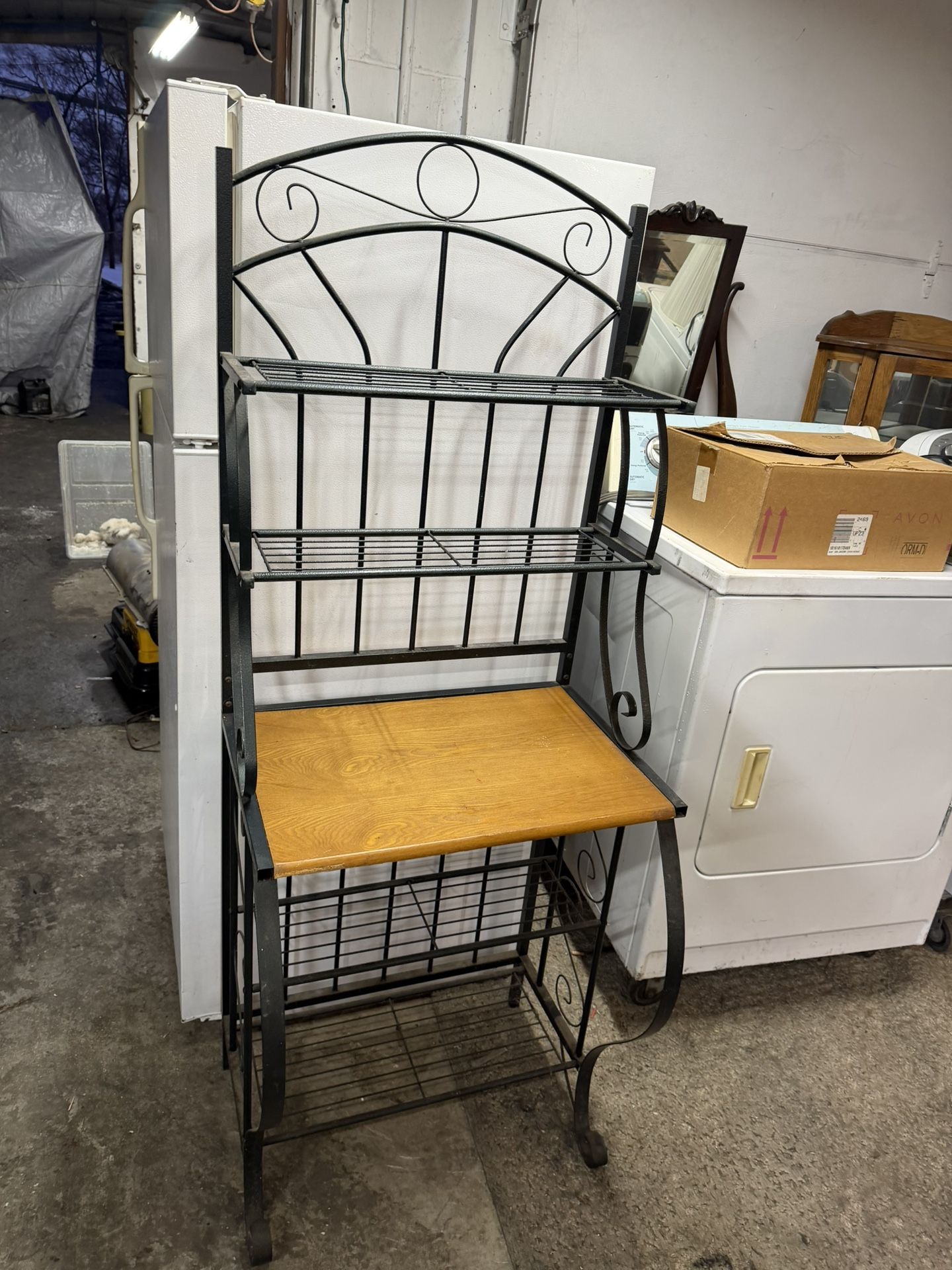 Bakers rack kitchen display shelf. Metal and wood. In good shape. Measures 25 x 19 x 66 tall. One piece. Pickup in Economy, few min from Cranberry.