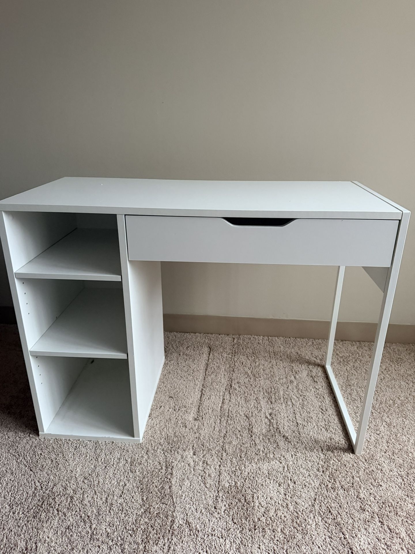 Desk, can be used as a vanity. Used like new no damage. All white, wood but light weight: if still posted it’s still available. Serious inquiries only please.
