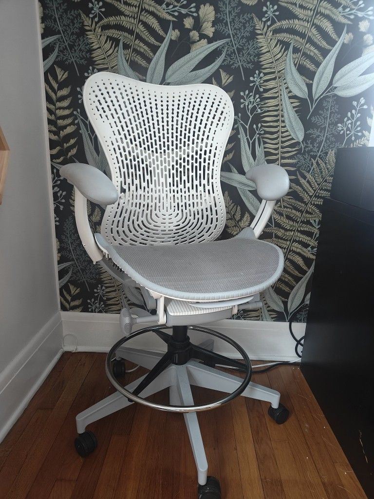 Adjustable high chair from Herman Miller Designed for freedom and movement, the Mirra 2 Stool is for people whose work style doesn't leave much room for sitting still. The intuitive adjustments and dynamic materials support a range of bodies, making this flexible counter-height office stool the perfect seat to share with coworkers and family. Mirra 2 Stool comes with two back options to further fine-tune your fit: the ultra-responsive Butterfly Back for a dynamic suspension membrane and the durable, easy-to-clean TriFlex back.