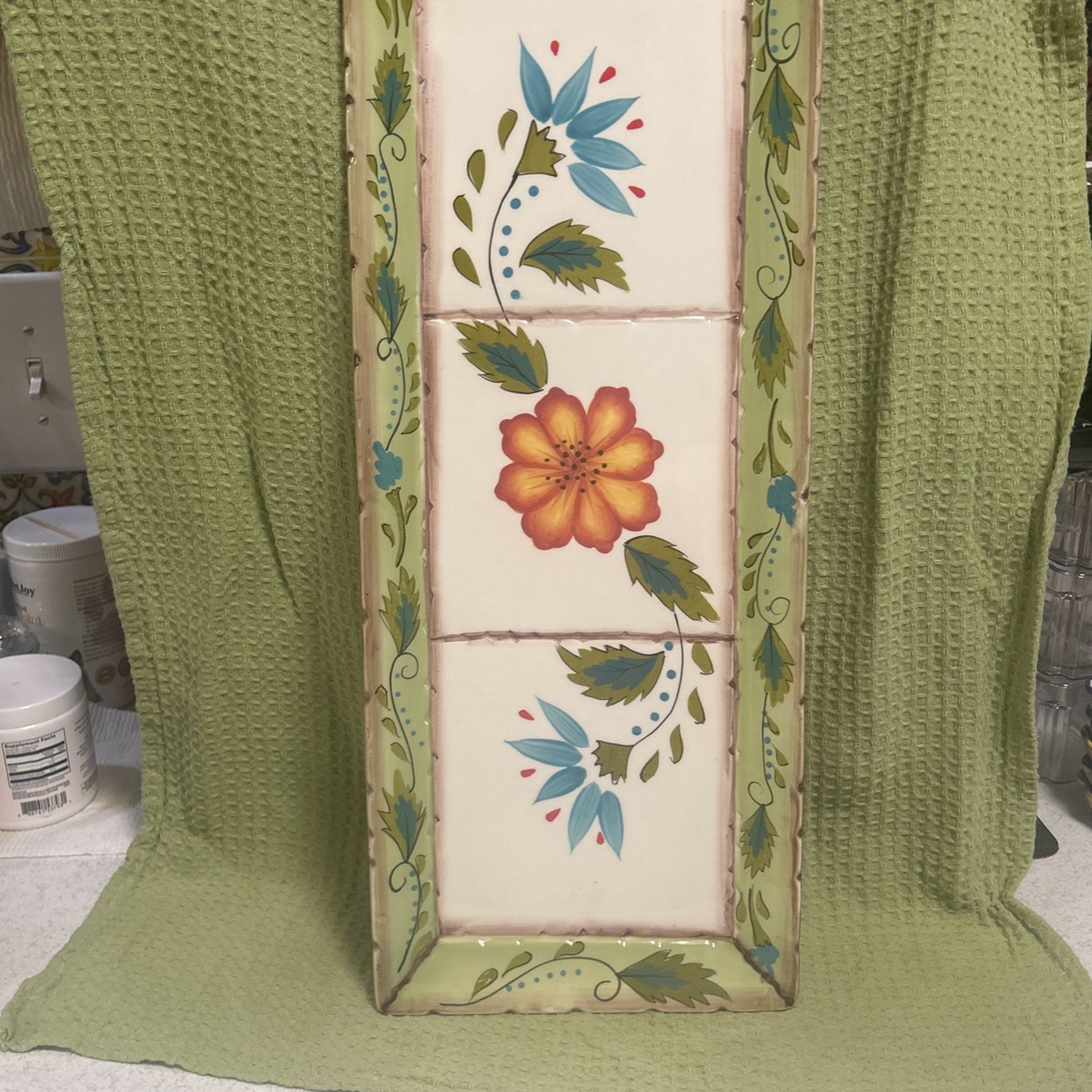 Ceramic serving platter. Oblong shaped 19” long and 8” wide. Beautiful colors. Made by Clay Art.