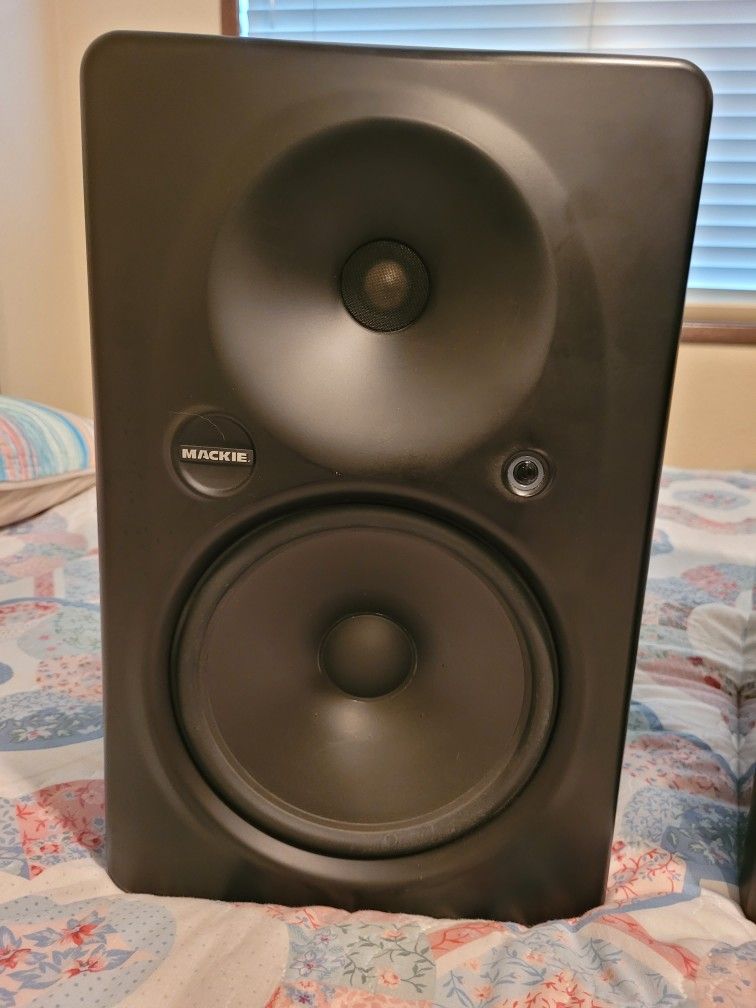 These THX Mackie HR824mll sound awesome. They are powered and come with several adjustments on the back to fine tune your sound. Beautiful ebony finish.
