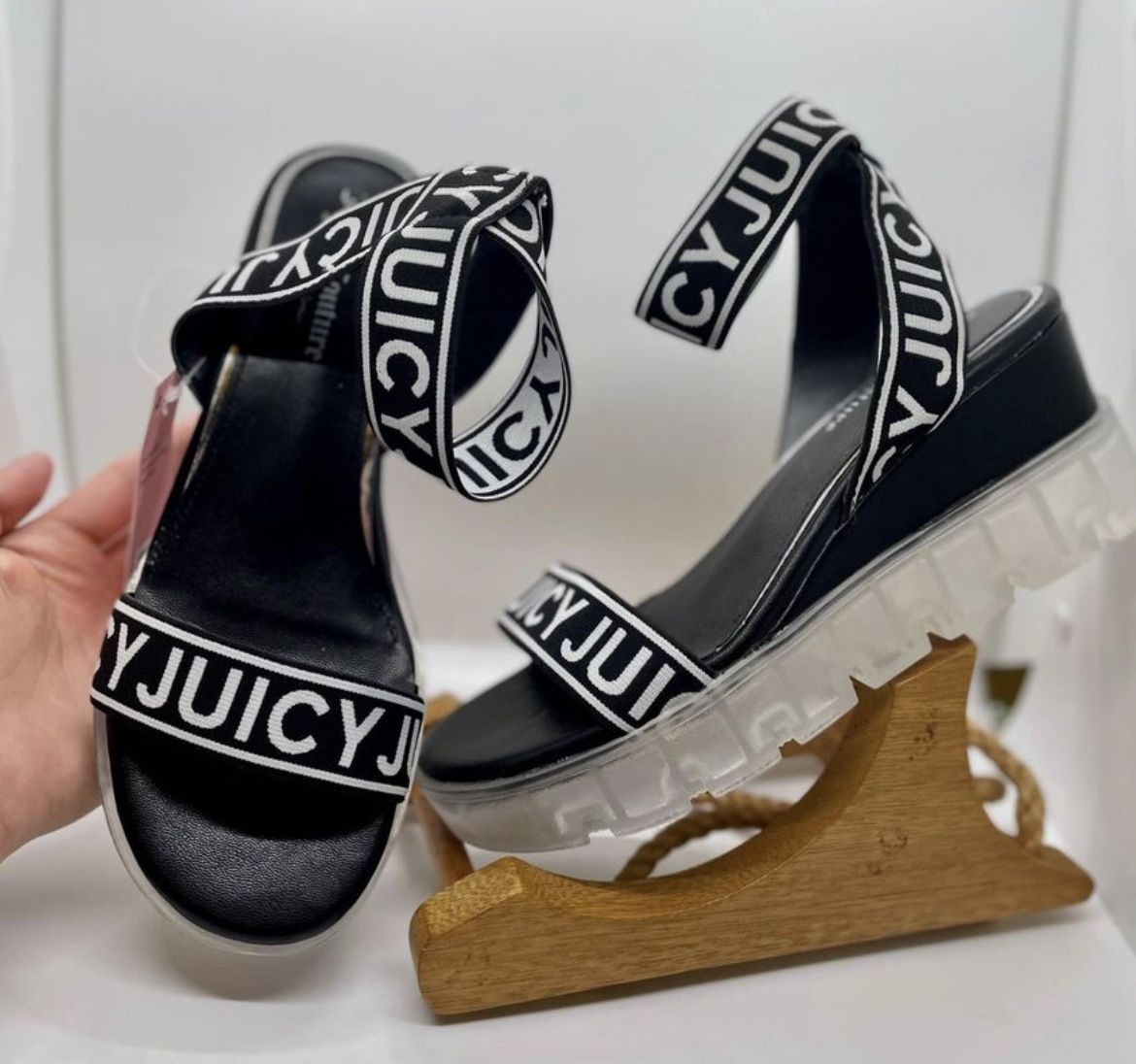 New with tags Juicy Couture Driven Strap Platform Sandals Size 8.5 Adjustable stretch Straps Wedge Heel 1.5” Transparent heel