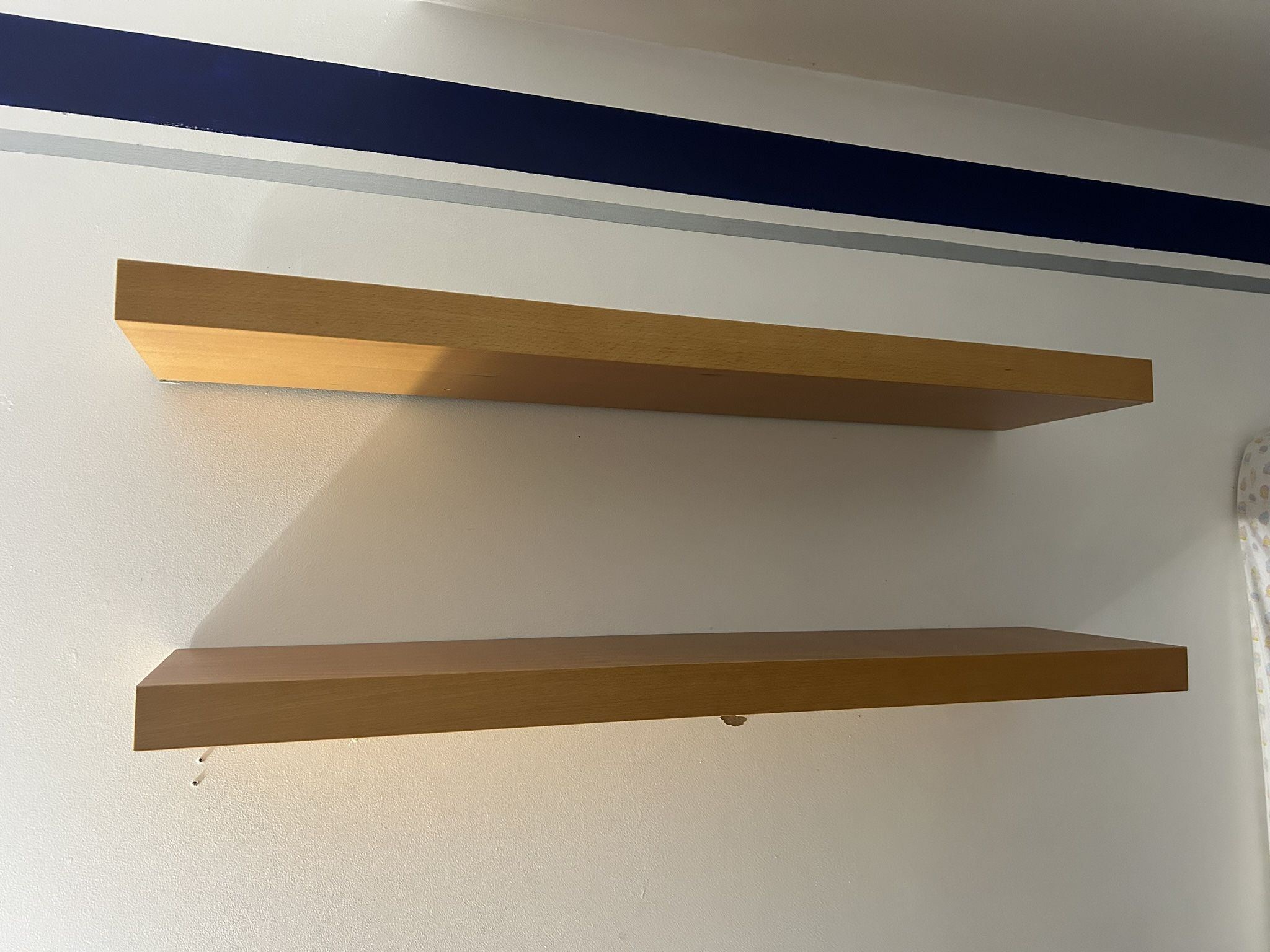 Two wall shelves, sturdy and looks new My daughter do not like them in her room any more