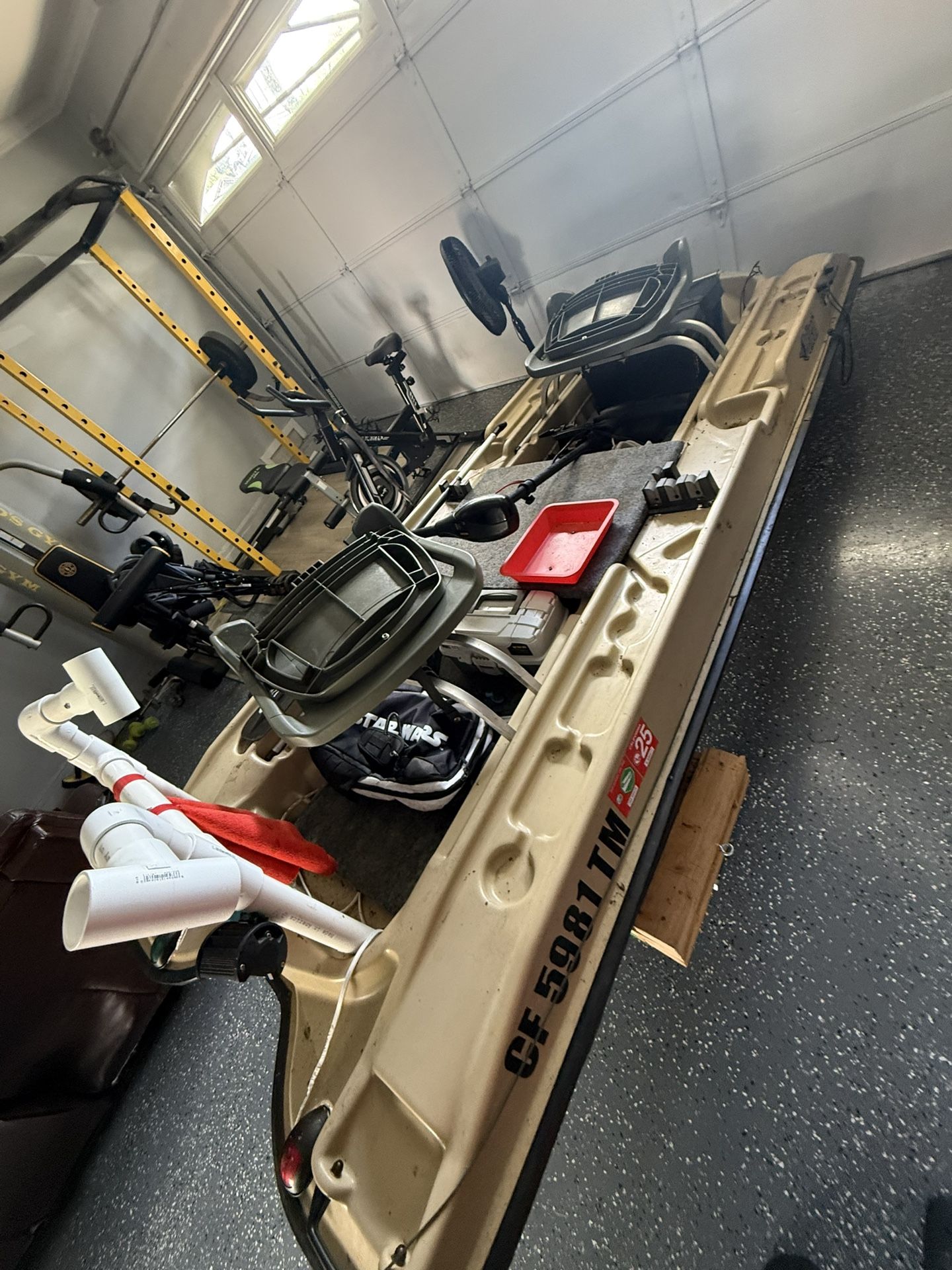 Small 10’ fishing boat, fits in the back of a small pick up truck. Comes with 55lb thrust trolling motor, spotlights, b navigational lights, 2 life jackets, and a paddle. Fitted with rod holders as well