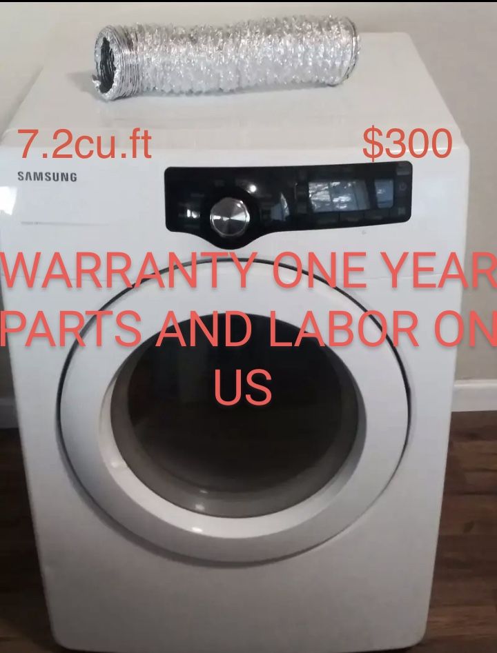 REBUILT SAMSUNG DRYER 7.2 CU FT 11 CYCLES 4 DRY LEVEL 4 TEMP WRINKLE PREVENT OPTION ECO DRY OPTION 1 - YEAR WARRANTY MEAN IF BREAK WE FIX OR REPLACE DRYER IF PARTS ARE REQUIRED ITS ON US ALSO LABOR ON US-PAPERWORK COMES WITH SALE-DRYER VENT NCLUDED- LET ME KNOW OUT OF PICTURE WHICH DRYER PLUG YOU NEED -WILL INSTALL DRYER FOR FREE- WILL REMOVE OLD DRYER FOR FREE- DO DELIVER NEAR AND FAR FOR A FEE YOU PAY ONCE WE COME INSTALL YOU SEE DRYER WORK AND WE SHOW YOU HOW DRYER WORK YOU SIGN THEN YOU PAY. WE ACCEPT CASH AND ZELLE