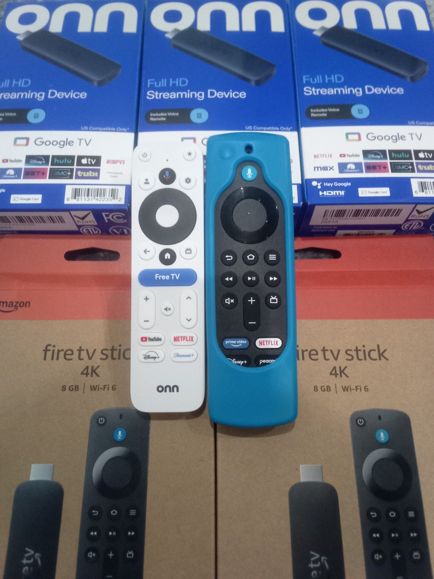 Onn and Fire TV streaming player device stick box