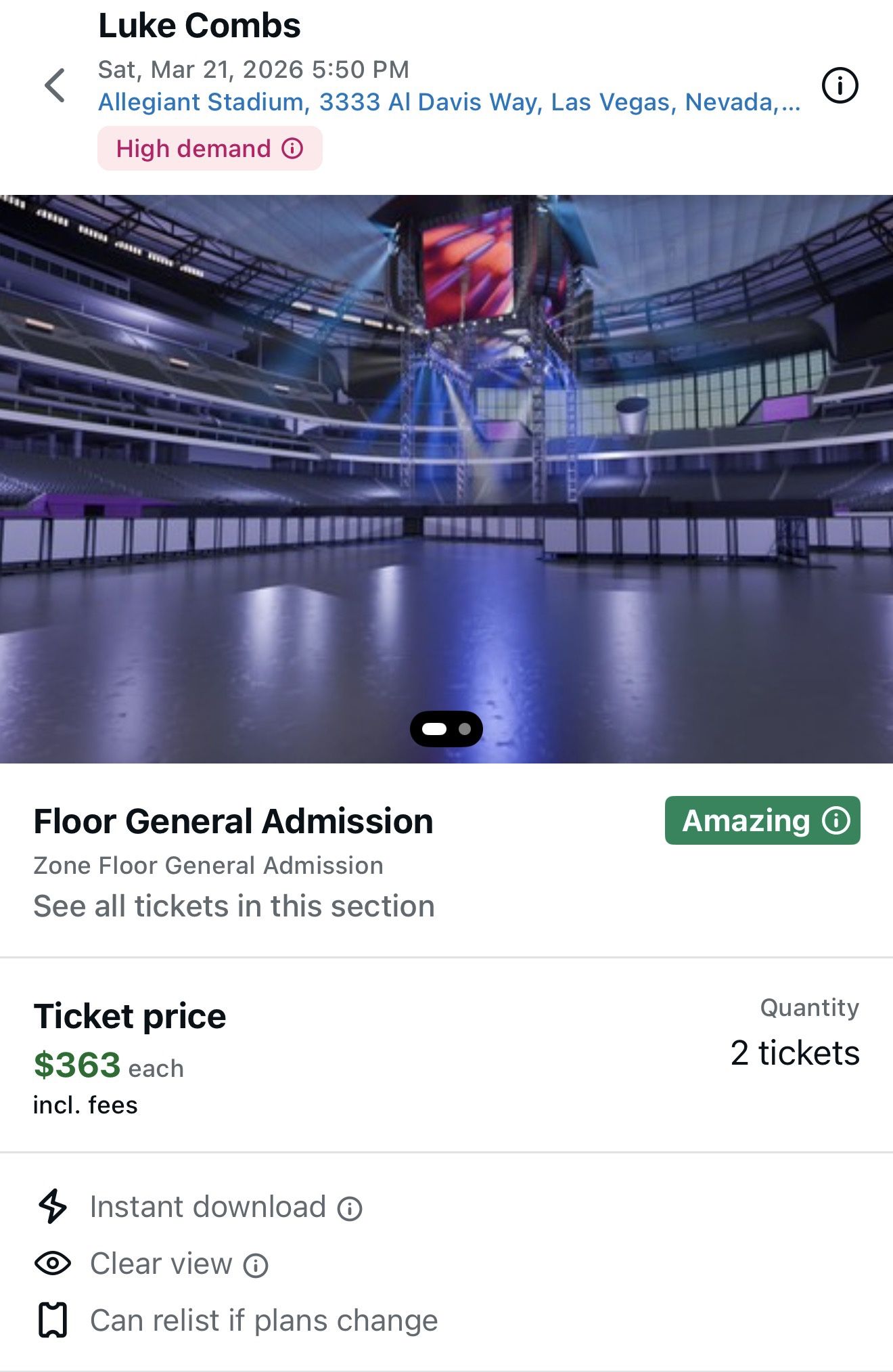 I have 2 tickets to next weeks Luke Combs concert at Allegiant stadium in Las Vegas. Price is $275 each. Instant transfer from Ticketmaster. Can meet if you want. 100% guarantee