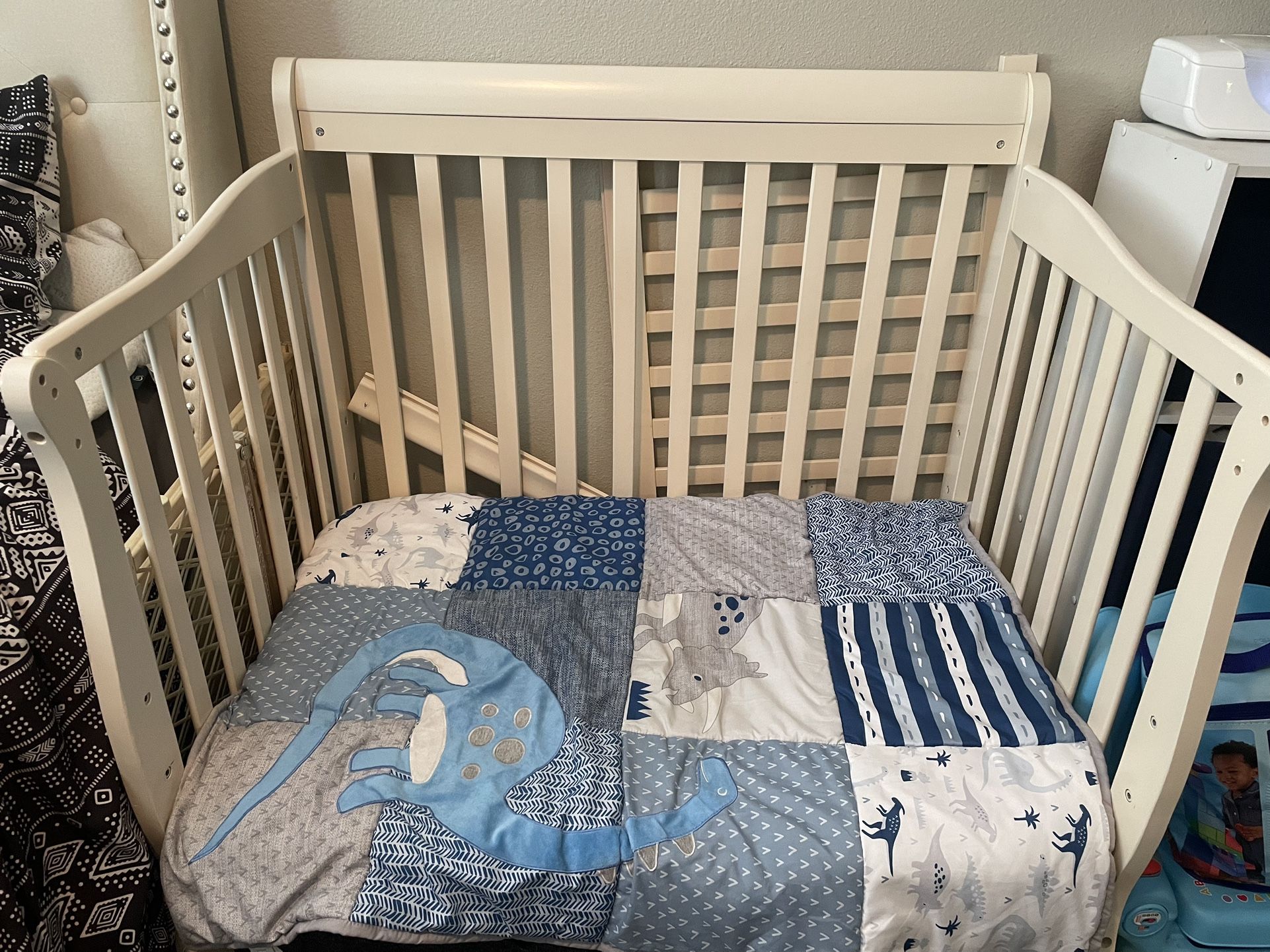 Cream mini crib my son grew out of just recently & upgraded him to a toddler bed Everything pictured is a set & all comes together which is the cream crib,mattress & extra padding Crib can transform into a mini baby bed by taking off front rail,all screws are together in bag & disassembled ready for pick up or $10 delivery fee