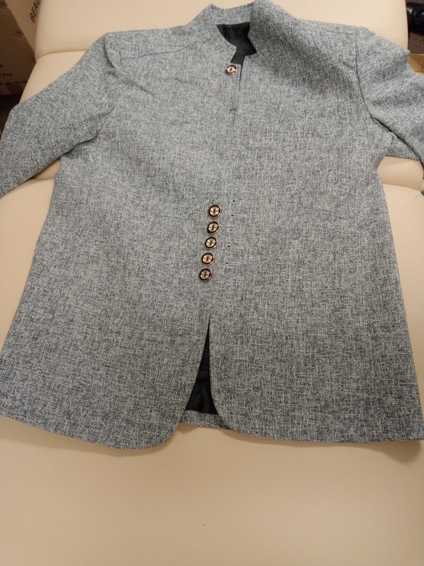Large, grey suit Blazer w/black and white mixed in, makes it look more black than grey... Inside pocket... Brand New... Fits slim to medium built guys.