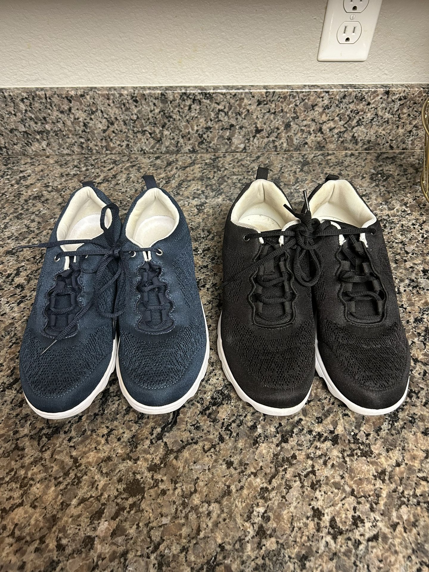 Blue pair brand new. Black pair worn a few times. Both size 8W
