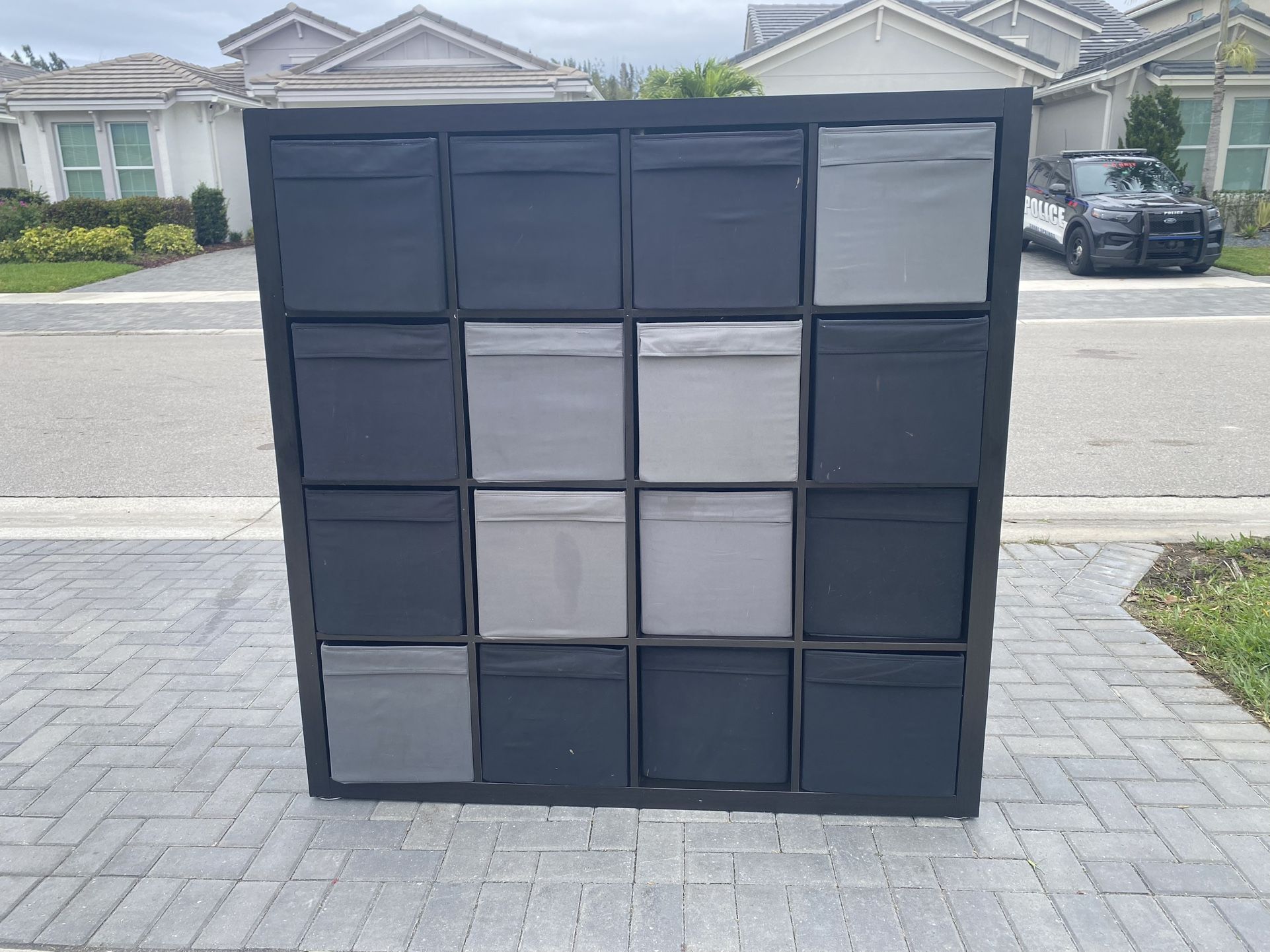 16 cube storage organizer with fabric bins included. Measures 59 inches long, 16 inches wide, and 59 inches tall. Overall in good condition with one small chip on the frame and minor cat hair on some bins. Sturdy and great for storage, closets, or organization. Pickup only.