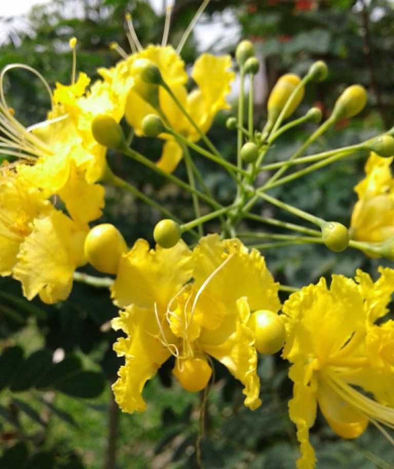 The plant I ship is about 3ft tall. Last photos are of one of actual plant. For plants bought together shipping is combined and discounted. This full sun beauty is great for smaller yards or an indoor houseplant, only growing to about 3-10ft. Blooms just as well in a pot or planted right in the ground! This can grow to 3-6ft wide as a bush or can also be trained into a small tree. Vivid yellow blooms outlined in white with very long showy stamens will appear spring through summer and will attract hummingbirds. These are on the drought tolerant side, so it's not high maintenance, what more could you ask for! Hardiness: USDA Zones 8 - 11. Peacock flower dies to the ground following frost or freezing temperatures, but in zone 8B, at least, it comes back reliable, late or middle spring. Don't give up on it! Peacock flower has survived temperatures as low as 18 F. It can be grown as an annual in colder climates. Even under frost free conditions, peacock flower may lose its leaves when temperatures drop into the 40's. Description The Pride of Barbados is an evergreen shrub or small tree that is a member of the Fabaceae or legume family. It is originally from Mexico and the Caribbean and has beautiful showy orange-red flowers, fern-like leaves, and prickles on its stems and branches. It is the national flower of Barbados. It may also be known as Barbados Flower Fence, Barbados Pride, Dwarf Poinciana, Peacock Flower, and Red Bird of Paradise. The genus, Caesalpinia, is named in honor of the 16th-century botanist, philosopher, and physician, Andreas Caesalpini. The species name, pulcher, is Latin and means beauty. The Pride of Barbados is a deciduous shrub in zone 9 and perennial in zone 8. In the tropics, it may grow 15-20 feet tall and equally as wide. The flowers are clusters of orange-red blossoms with long red stamens. They blossom most of the year in the tropics. In climates where frost occurs, the flowers appear late summer and fall. After flowering, the fruits appear which are pod-like. When they ripen, the pods split open and disperse the small seeds. The seeds contain tannic acid that is poisonous and can result in gastrointestinal discomfort if ingested. Exercise caution if using this specimen in areas frequented by children or pets. Hot humid weather and full sun ensure flowering. It is intolerant of poorly drained soils. Once it matures it tolerates some drought. During the growing season, they perform best if watered deeply but infrequently. Pruning may be needed to maintain its shape. It may be best to avoid planting this shrub near patios or walkways due to its prickly stems and branches. Used as a specimen, accent, or border, it would add beautiful color in a sunny, hot, and humid area. The flowers also attract hummingbirds and butterflies. They are considered deer resistant. In terms of pests and diseases, the shrub may develop scale and may be susceptible to mushroom root rot in poorly drained soil. Pictures depict grown up plants and its possible applications. Height of the plants is measured from the base of the root ball. No returns, refunds or exchanges