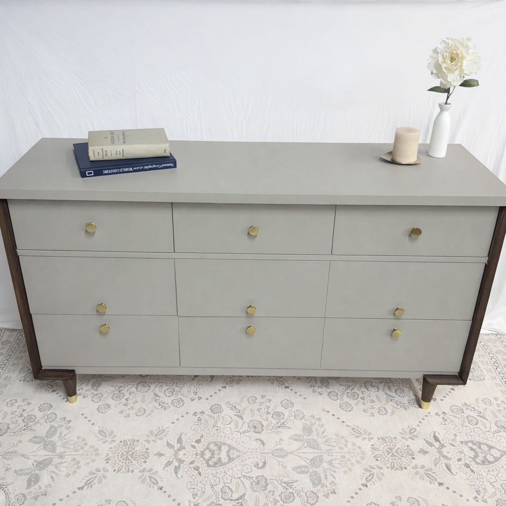 Beautiful vintage Cavalier 7-drawer dresser that has been freshly refinished. Classic mid-century lines with solid construction and dovetail drawers. The dresser features a soft neutral finish, warm wood trim, and new brushed brass hardware. All drawers slide well and offer excellent storage. Includes the original glass top to protect the surface. Also includes the original attachable mirror. One of the mirror clips is broken, but the mirror still attaches and functions. Details: • Vintage Cavalier furniture • 7 spacious drawers • Solid wood dovetail drawer construction • Original glass top included • Original attachable mirror included (1 clip broken) • Freshly refinished Dimensions: 58.5” long 18” deep 32.5” tall This is a very sturdy, well-made vintage piece that will last for many more years. Pickup in Tacoma.