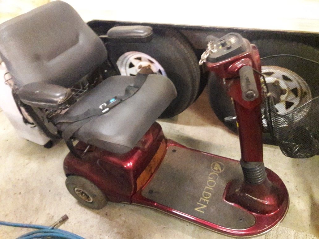 Golden Companion 3 wheeled mobility scooter. Has some arm rest wear and a few scratches. Has front and rear baskets. Works great. Brand new tiller piston.
