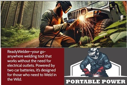 ReadyWelder2 Portable MIG Welder. Works off 2 12volt Car Batteries. Works best with Gel Cell Batteries. I had it set up in the trunk of my car and did welding for Apartment Complexes on their stairs. I have added an extra long set of leads.