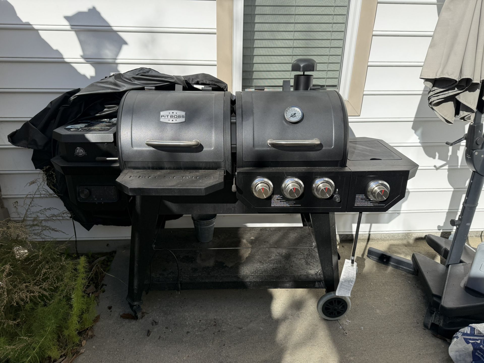 Liquid propane & wood pellet combo 1 side burner . Still under limited warranty ! Free delivery up to 15 miles