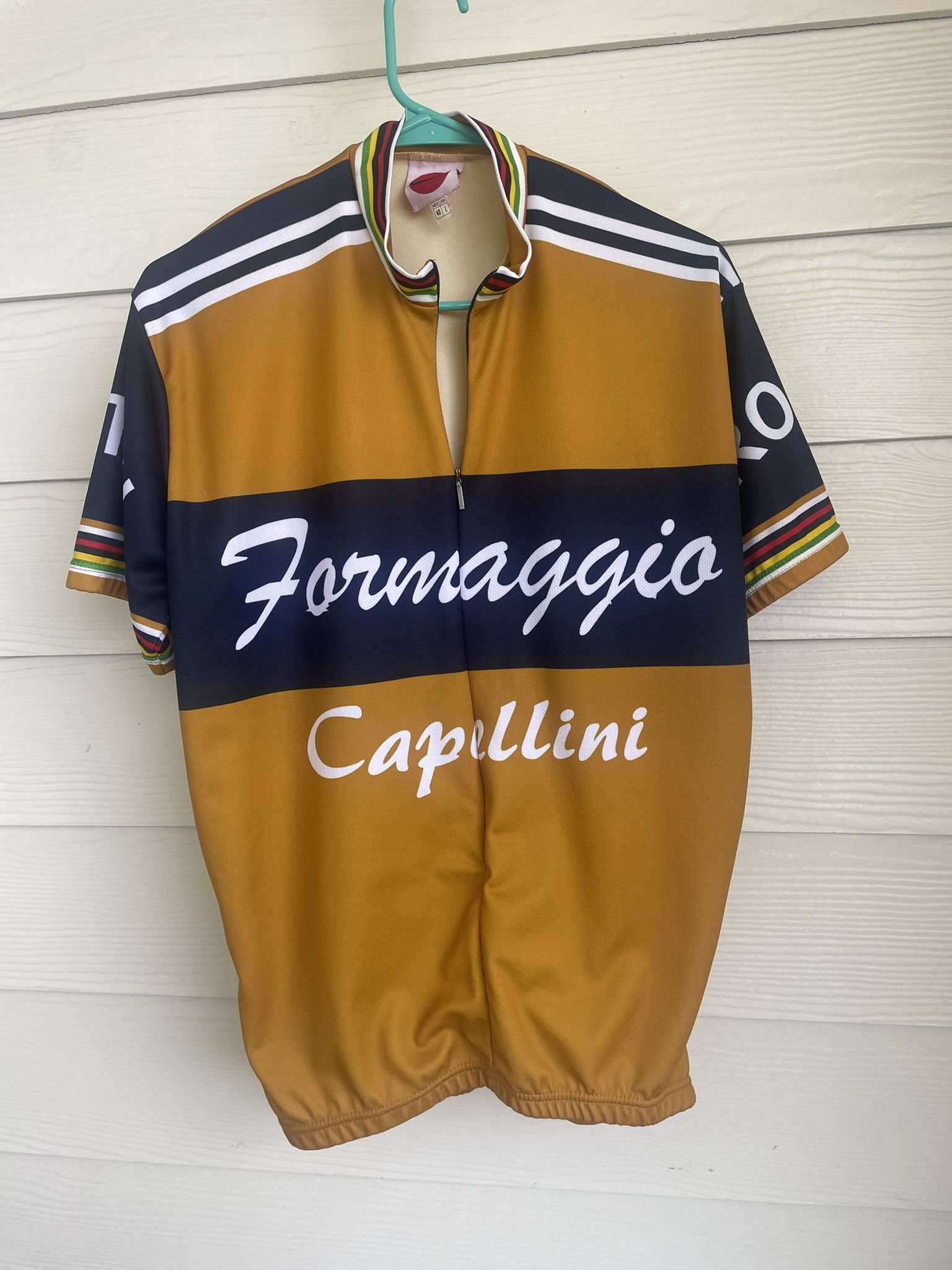 World Jerseys Formaggio Capellini Men's large 3/4 Zip Cycling Jersey, perfect for any cycling enthusiast. In very good condition, no tears, no holes This jersey features a band collar style, short sleeves, and a lightweight, breathable fabric with contrasting trim. It also includes various features such as anti-microbial A moisture-wicking, and quick-dry, making it perfect for summer, fall, and spring seasons. The jersey has a regular fit and is made of 100% polyester it’s comfortable and breathable It also has 3 pockets in the back and wrinkle-resistant.