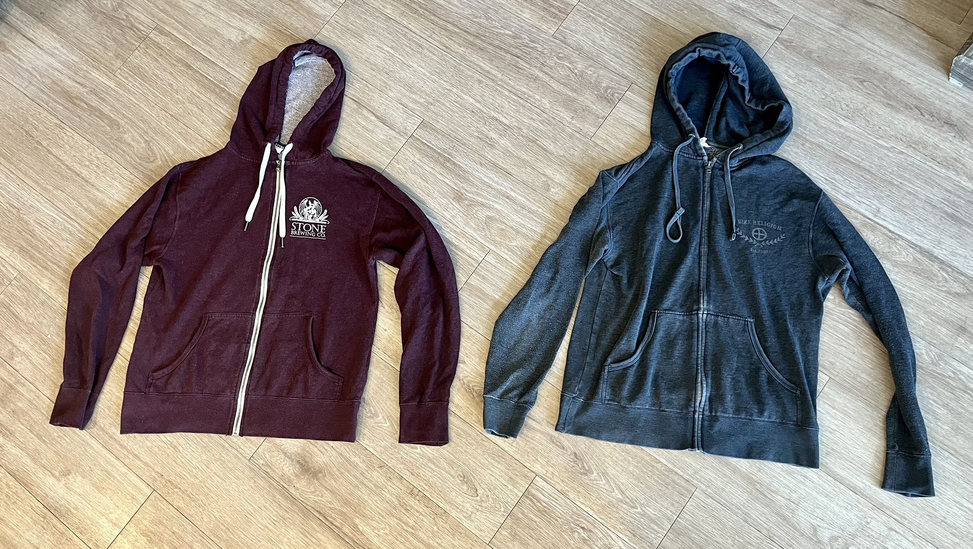 For sale is a set of two Men's Small Full Zip Hooded Sweatshirts. $5 gets both! QTY 1 Stone Brewing in Burgundy QTY 1 Bike Religion in Washed Black