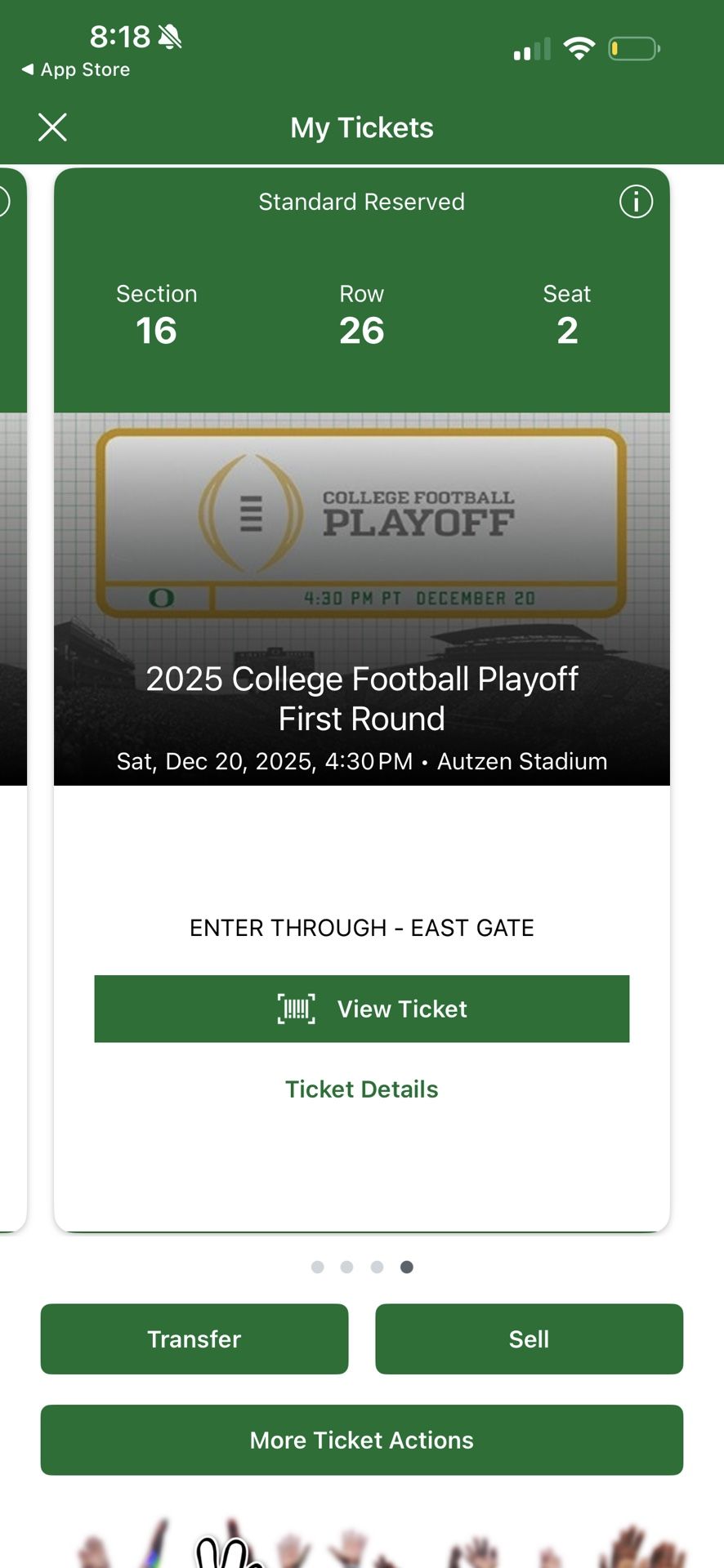 Selling 2 tickets to the Oregon Ducks playoff game on Saturday December 20th at 4:30. Section 16 row 26 seats 1-2. On the Ducks side of the field. Seats are on the end of the isle. Selling both for $350
