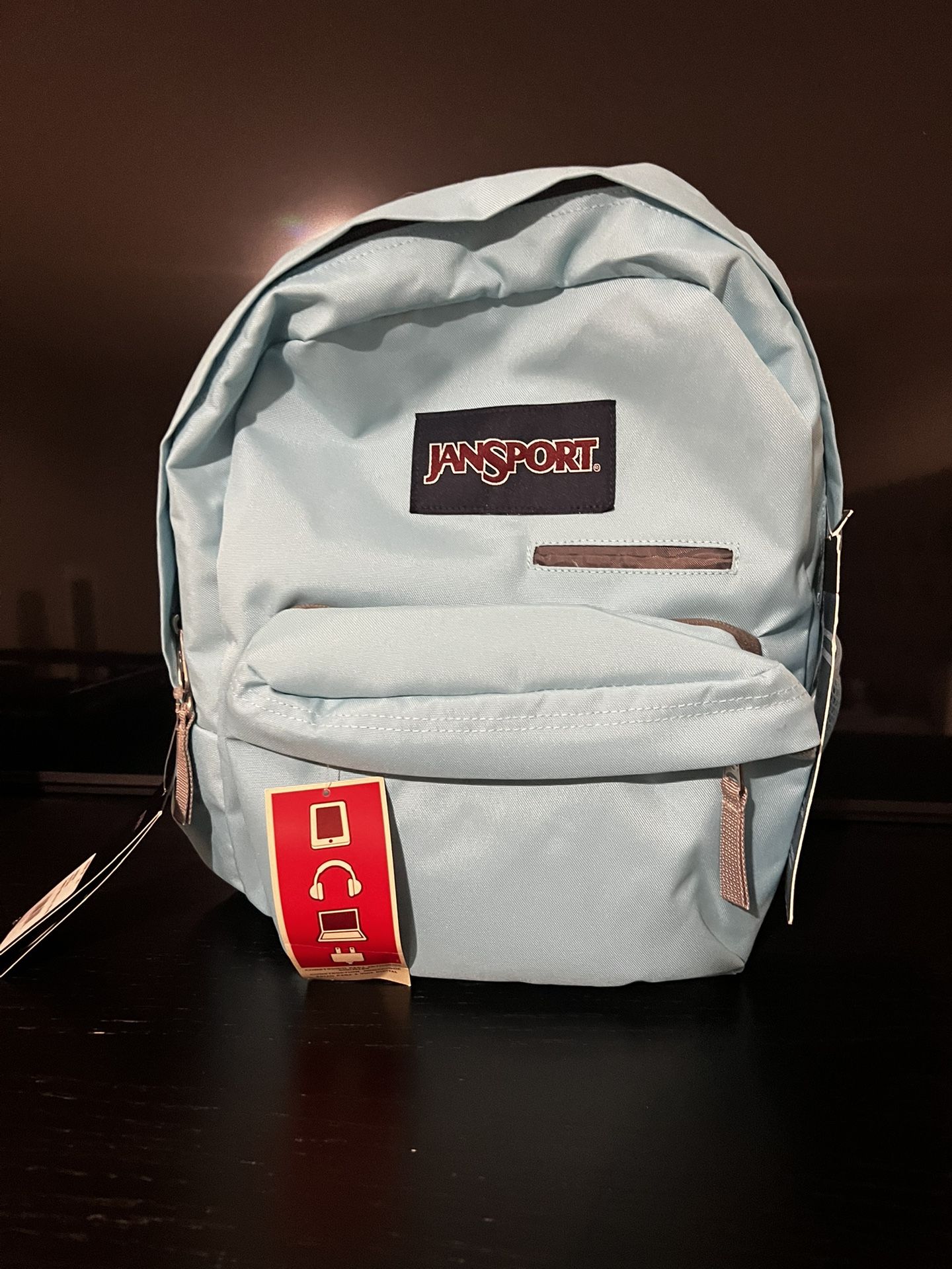 JanSport SuperBreak Plus Backpack. The SuperBreak Plus is a fresh take on the classic SuperBreak pack with an internal laptop sleeve and side water bottle pocket, making this pack as functional! Brand new with tags! It is light blue not teal. The picture with white background is true color. Light Blue