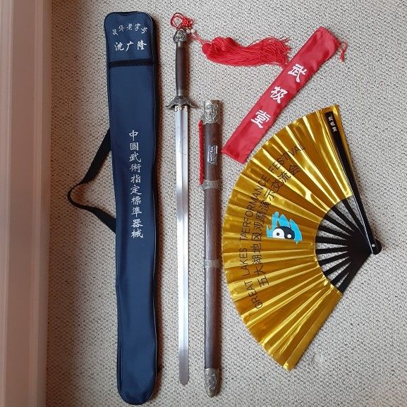 Chinese Tai Chi Sword, Full Tang Hand Forged stainless steel with sword Bag. And a Tai Chi Fan with fan bag. Both items are hardly used, and they are as good as new.