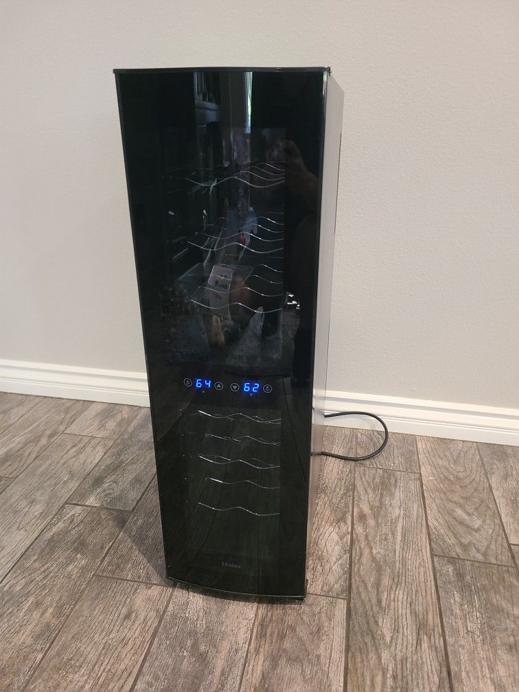 Haier dual temperature zone wine fridge with 16 bottle capacity. Lightly used and in great shape, works well. Originally bought for over $200 new Dimensions: 32.75" H 10" W 20.5" L