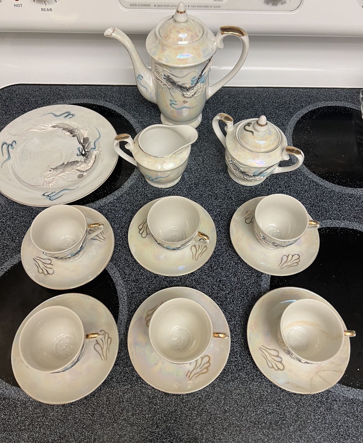 Dragonware Lusterware Moriage Tea Set with Lithophane Geishas, Japan Gold rim on plates, tea pot, sugar and creamer server has gold plated edge and ring worn off. One tea cup, the serving tea cup plate plate and the tea lid pot were broken and glued back. See pictures for more details. Selling as is.