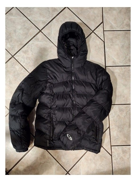 Black hooded puffer jacket. Full zip closure. Small size. Polyester fill. Excellent for cold weather. Text for more pictures or information