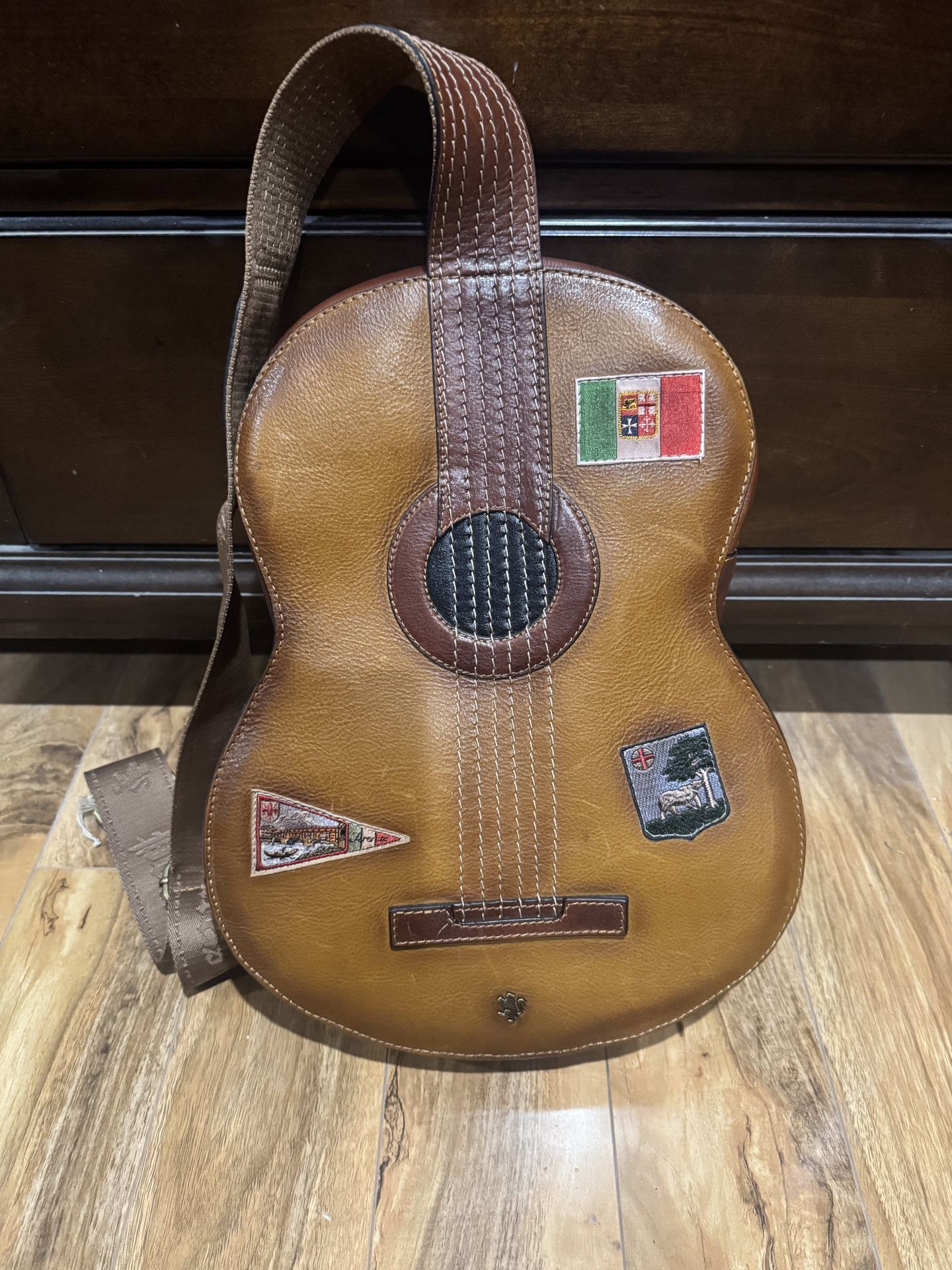 PRATESI Made In Italy Leather Sling Guitar Shaped Backpack With Shape Patches - New without tags. Never used. Originally retails for $300. Color: Brown (Cognac). Dimensions: 16”H x 12”W x 3”D.