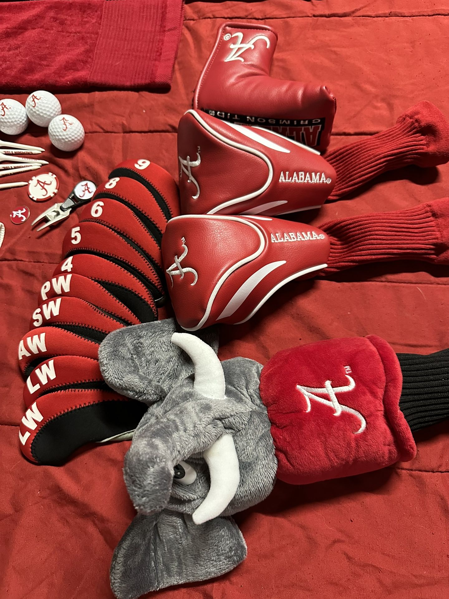 Alabama crimson tide golf bag, With all club and golf play accessories.. Alabama glove(right handed), Alabama divot repair tool, 4 Alabama golf balls, 6 Alabama tees, 2 Alabama putting markers, roll tide cuzzi, Alabama towel, Alabama umbrella, 2 LW-AW- SW-PW-4-5-6-8-9 iron head covers. Alabama Putter cover, 3 drivers head covers with 1 the mascot cover. never used, (HAS NEVER HAD A CLUB IN THE BAG)Same with the golf shoes (Ignite pwradapt caged DISC) size 9 1/2 never worn, never used.. 150$ for everything (Firm) ALWAYS up for trades.!!!