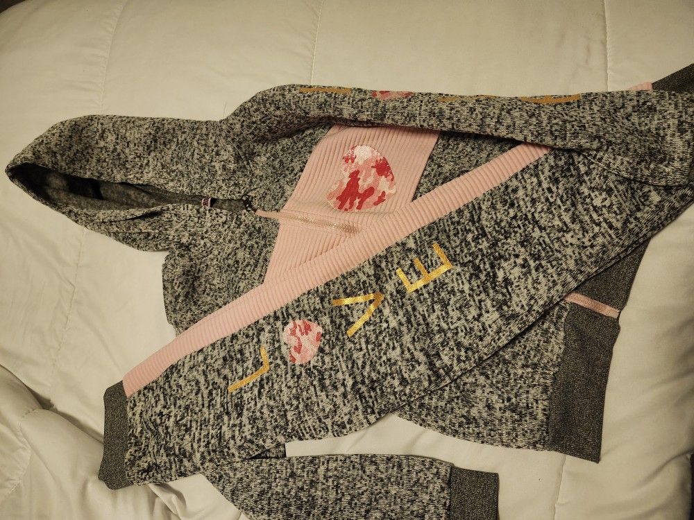 One 2 piece set, long sleeve shirt and sweatpants. Sweatsuit is a size 7/8 Sweatpants is a size Medium Hoodies are sizes Large and Medium 8/10