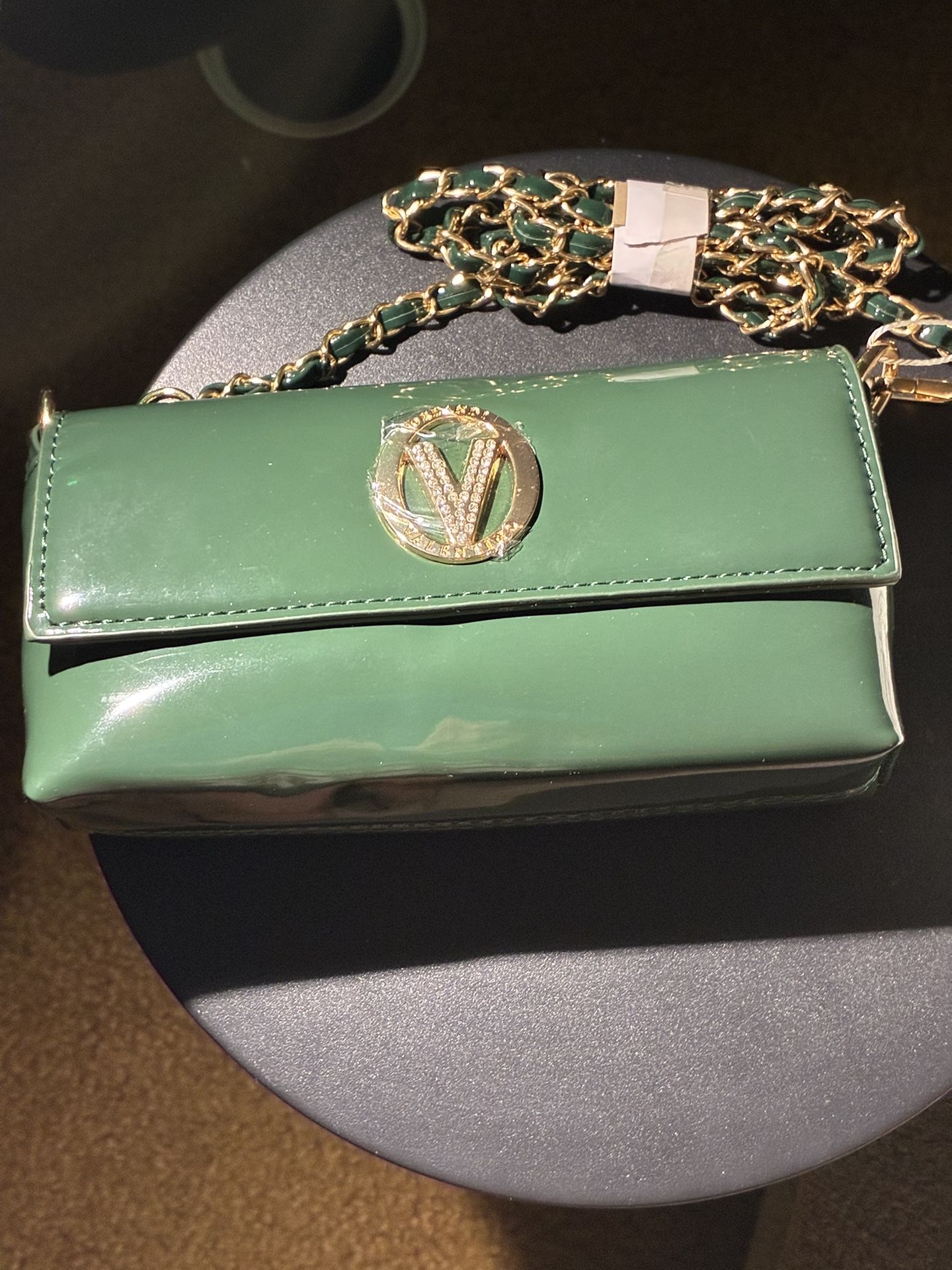 Valentino Orlandi-Green Evening Bag with a Gold/Rhinestone Valentino Emblem