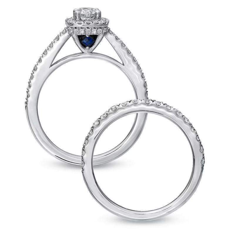 From the Vera Wang Love Collection, this round diamond frame bridal set offers incomparable beauty and unmatched quality. Crafted in 14K white gold The engagement ring features a mesmerizing 1/3 ct. round diamond center stone surrounded by a squared frame of smaller accent diamonds. Additional diamonds grace the shank. Set into the gallery are two princess-cut blue sapphires, the signature of the collection and a symbol of faithfulness and everlasting love. On your wedding day, complete the set by adding the coordinating diamond wedding band. This bridal set shines with 1 ct. t.w. of diamonds.