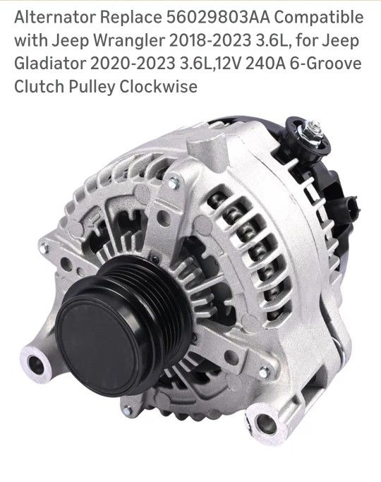 New alternator Compatible with Jeep Wrangler 2018-23 3.6L, for Jeep Gladiator 2020-23 3.6L,12V 240A 6-Groove Clutch Pulley Clockwise. Alternador Nuevo para Jeep Wrangler Gladiator 2018-23 motor 3.6L. De 240 Amperes Located on 95th ave and Olive