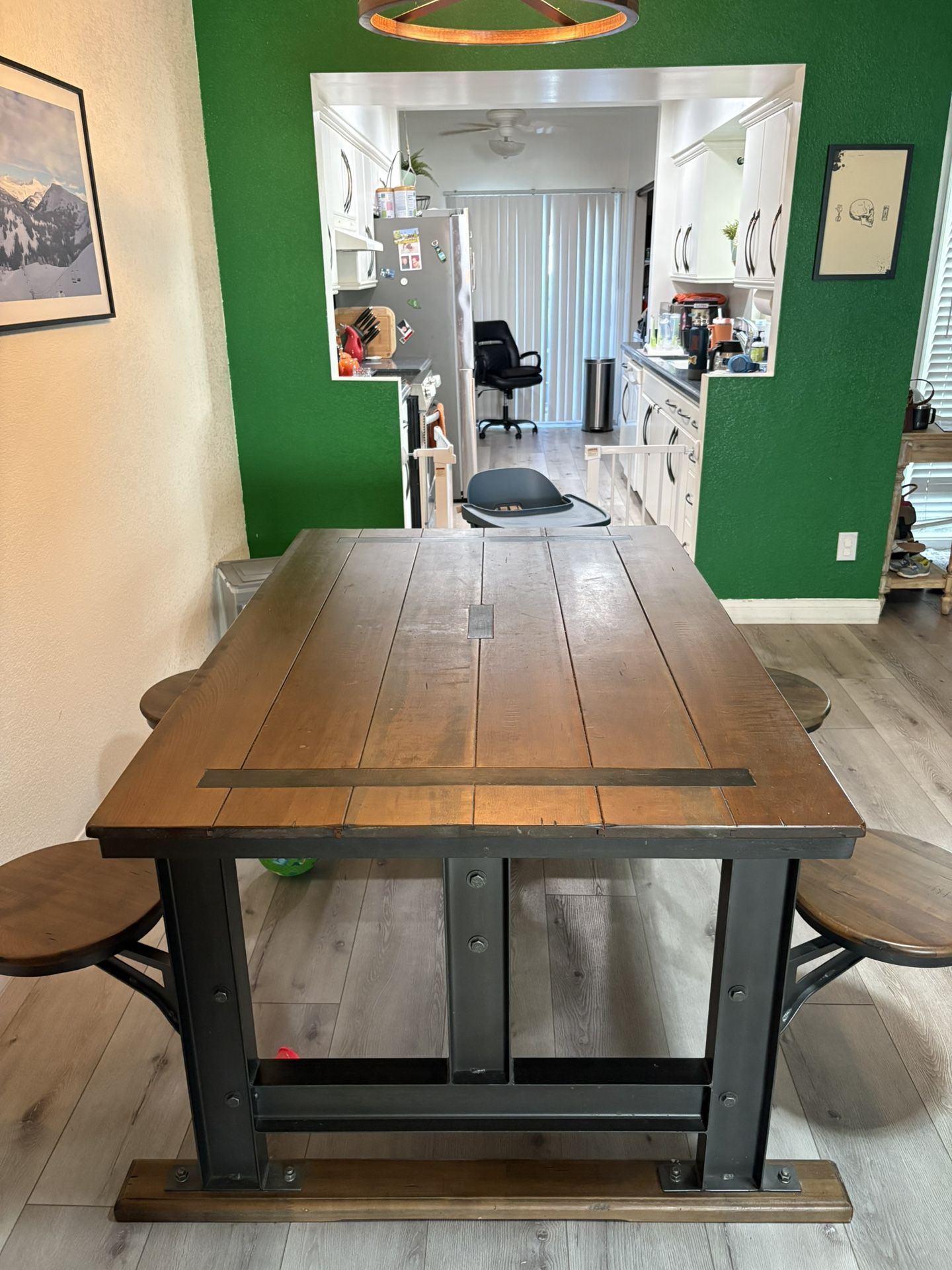 World market heavy duty wooden table. Amazing quality with four attached swivel stools. Very heavy so will need to be disassembled before transport but can see ahead of time if needed.