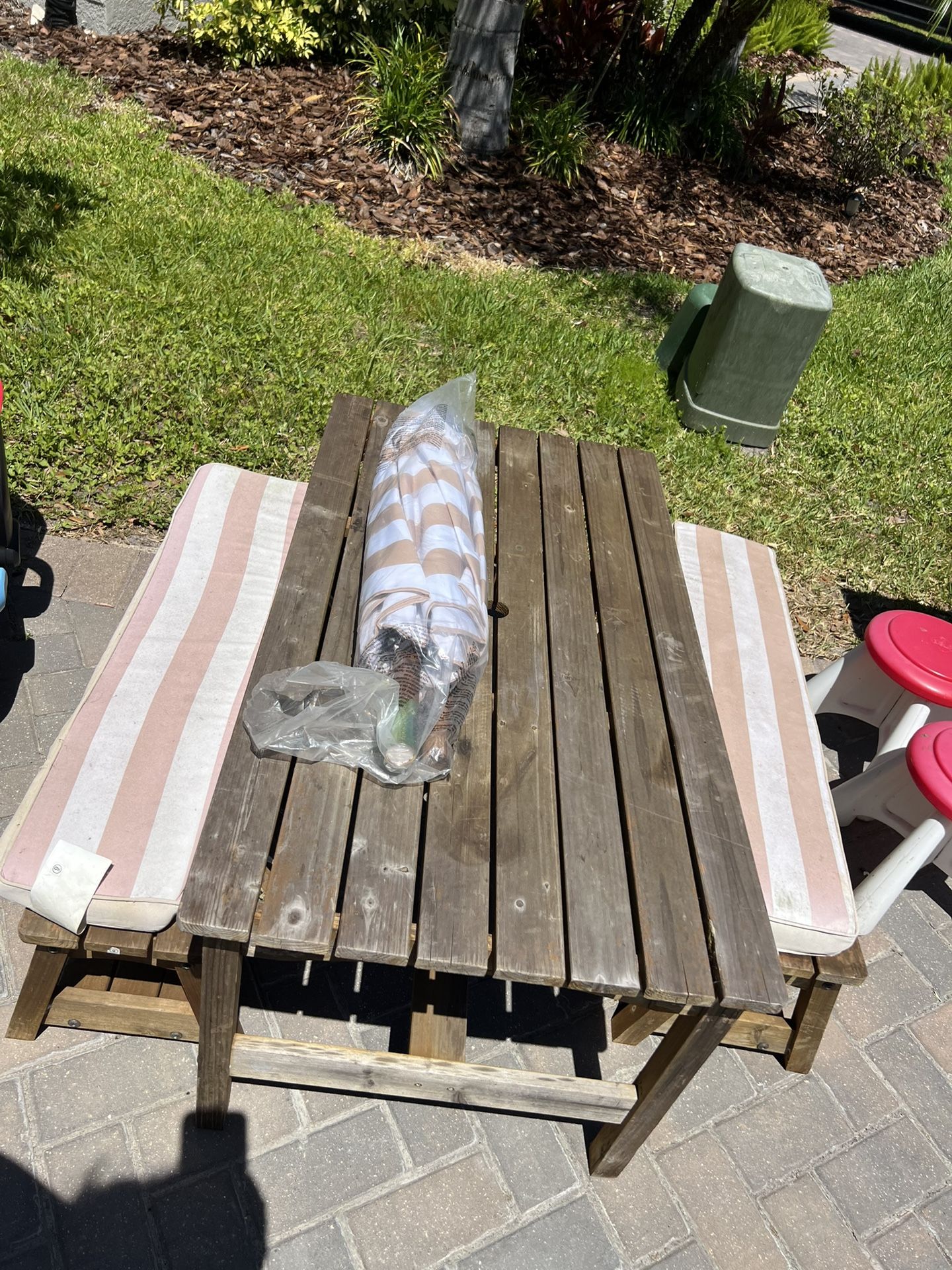 Kids Wooden picnic table and benches with cushions, washable cushion covers, and umbrella. “Honey” color.