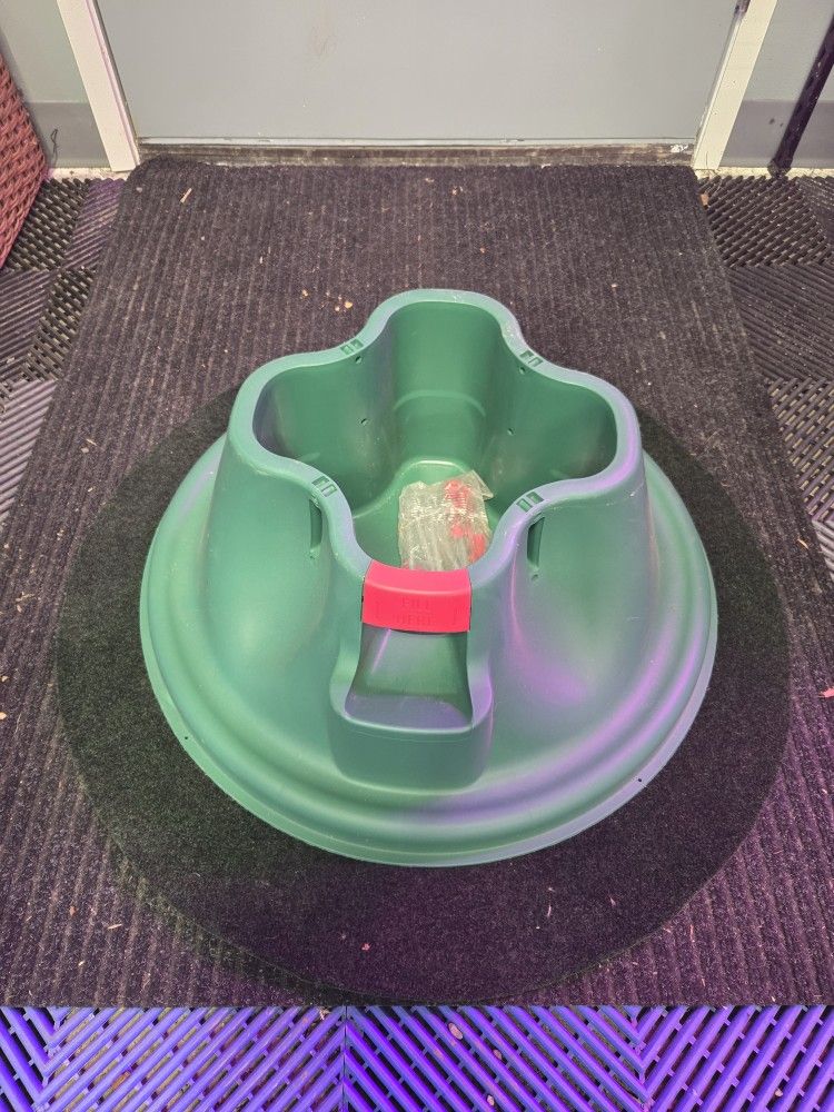 Heavy duty plastic will not stain rust or scratch floor. Can accommodate up to 10 ft tall Christmas tree holds up to 1 and 1/2 gallons of water. Broad stable circular base rimmed lip to catch water. Includes apron.