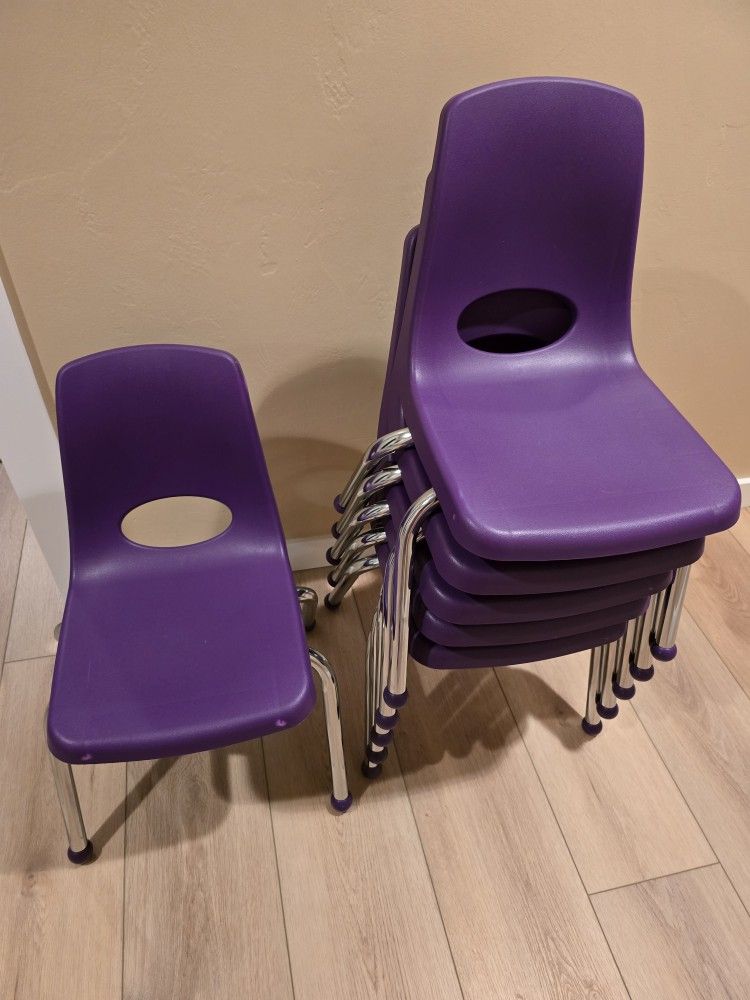 Very gently used, terrific condition Factory Direct Partners (FDP) 14" School Stacking Chairs Student Seat with Chromed Steel Legs and upgraded Ball Glides. For In-Home Learning, Classroom or Playroom. Color: Purple. Sold as a set of six (6) for $100 total, equal to $16.66 for each chair, original price was $54 each. If you want less than 6 then they are $20 each . Dimensions: see photos Chair width: 17" height: 26" depth: 14.5" Floor to seat: 14" Seat dimension: 12.5 x 12.5" Northeast Tucson will meet for pickup.