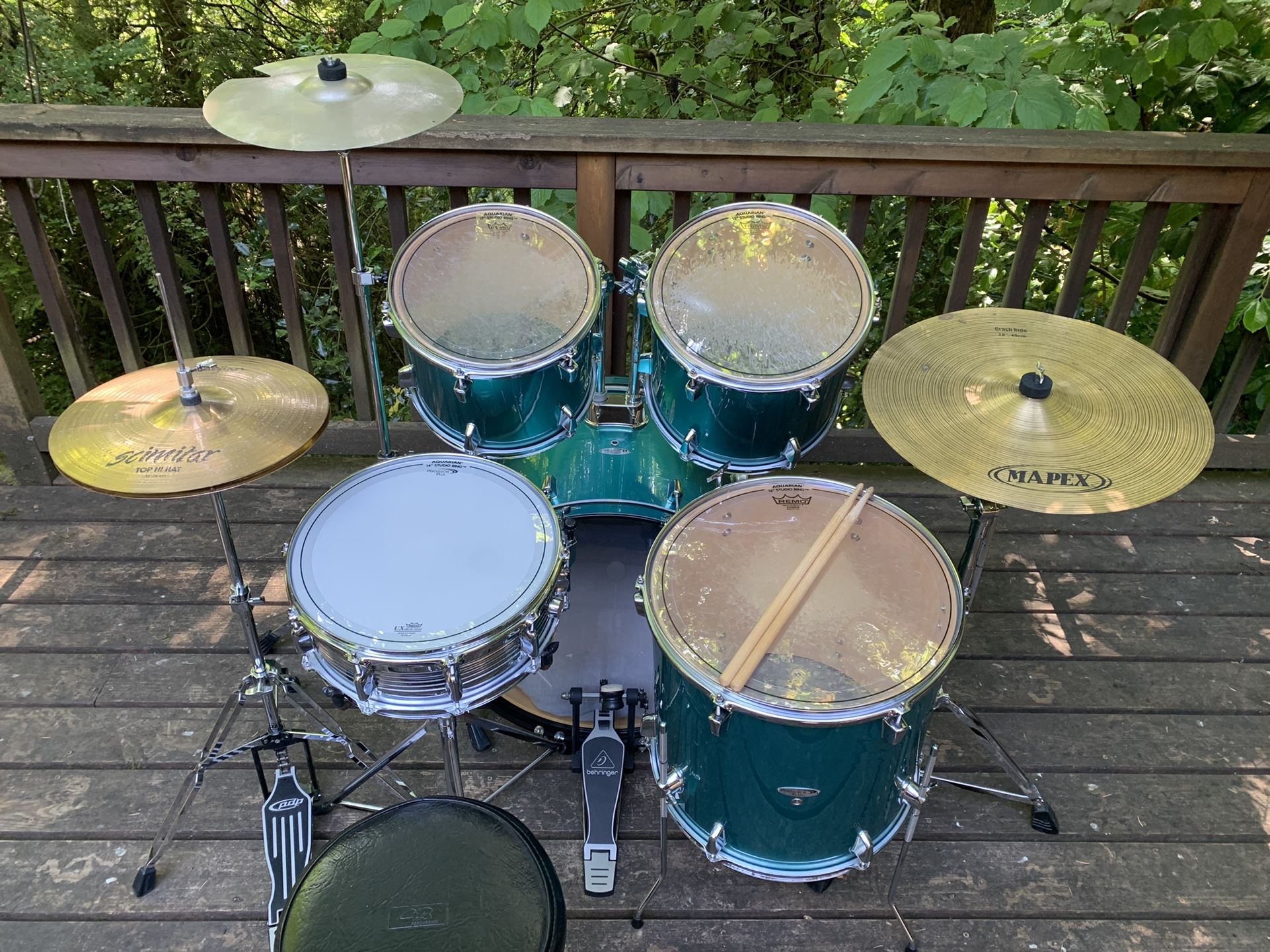 Percussion Plus drum set in excellent condition, tuned 22” bass drum 12” and 13” toms 16” floor tom 14” snare drum generic drumhead on the bass, Remo Emperor drumheads on the toms, new Remo UX coated drumhead on the snare drum Aquarian dampening rings on the snare drum and toms Behringer bass drum pedal PDP hi hat stand vintage snare drum stand Mapex cymbal stand generic cymbal stand 14” Zildjian Scimitar hi hat cymbals 15” vintage Ludwig Paiste crash cymbal, repaired 18” Mapex crash/ride cymbal drum throne: Gig Percussion base, CB Percussion seat Vic Firth drumsticks tuning key