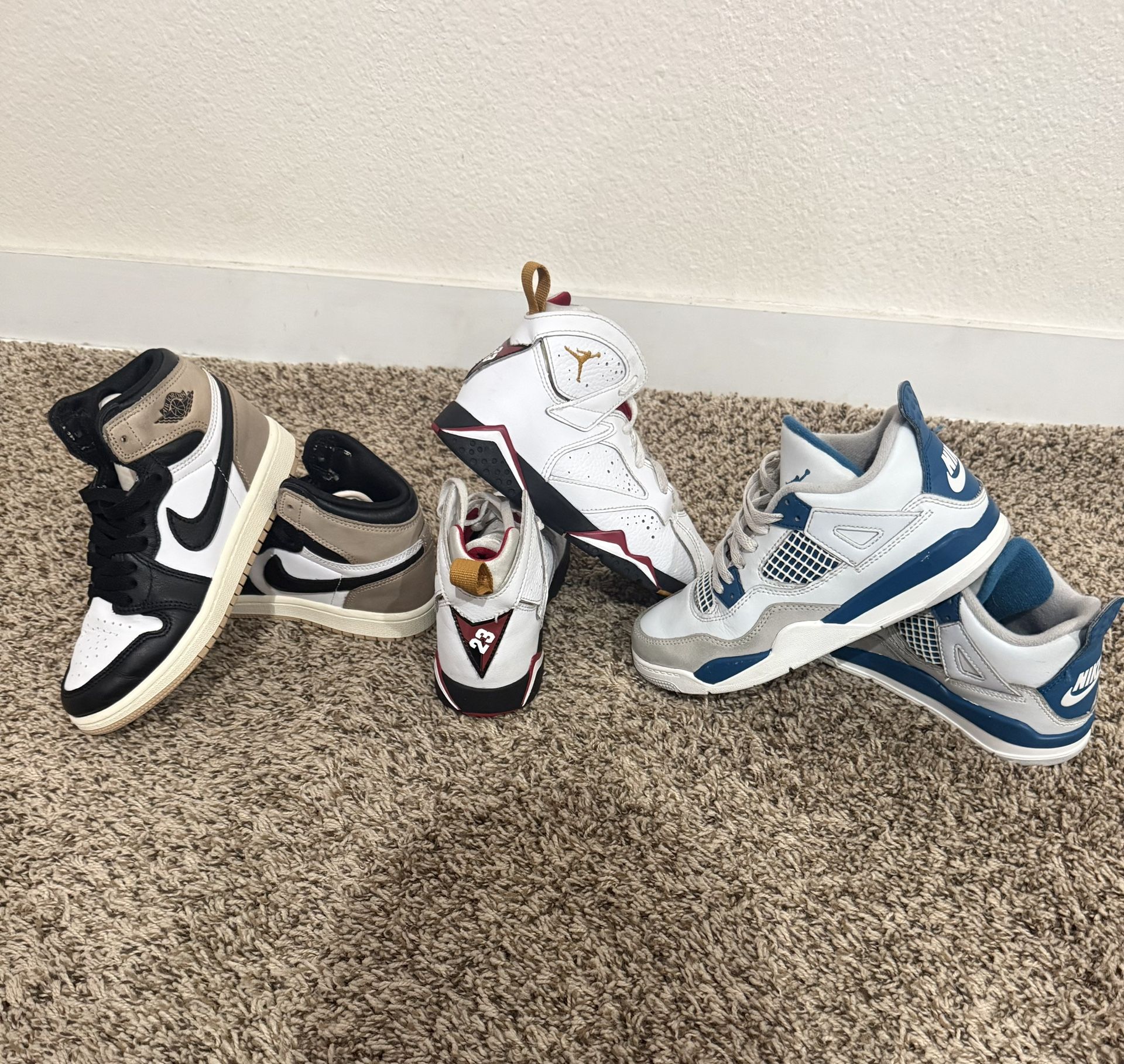 Air Jordan Retro’s (Used) ALL SIZE (1Y) Air Jordan retro 1’s (Black/brown) Air Jordan retro 7 (white/burgundy / black) Air Jordan retro 4 (Blue) All for $100