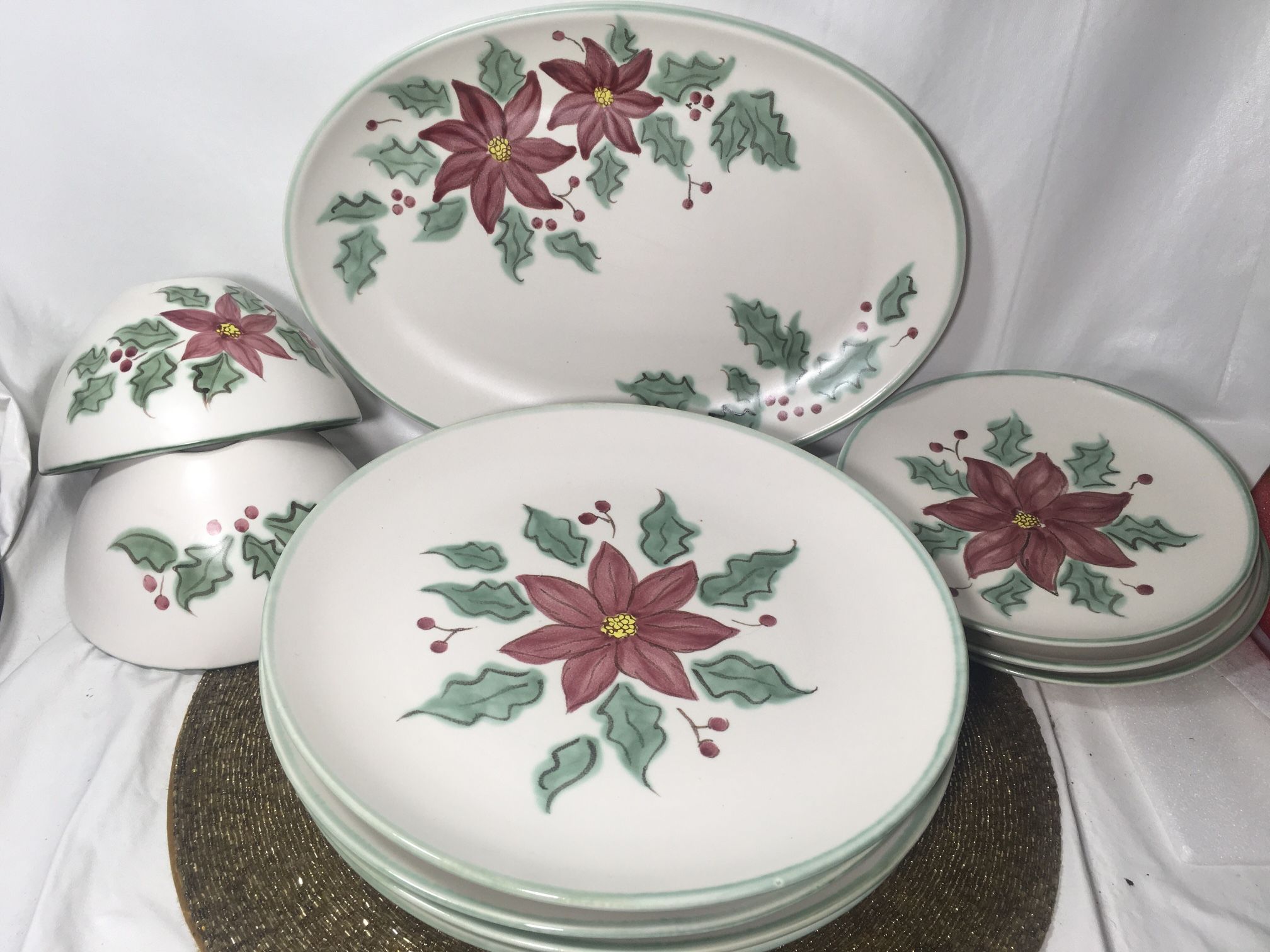 10 piece dinnerware Christmas poinsettia and Holly ceramic set plates bowls platter