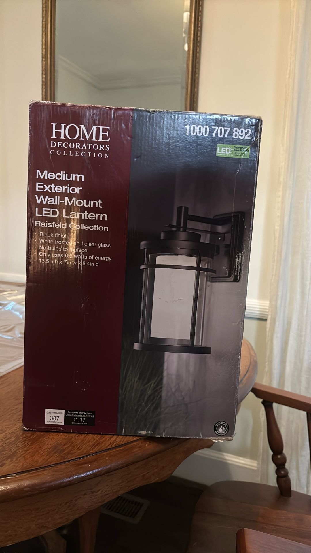 Medium exterior wall mount LED lantern from home decorators collection parentheses Home Depot. This is $125 on https://offerup.com/redirect/?o=aG9tZWRlcG90LmNvbQ==. This is new in the box.