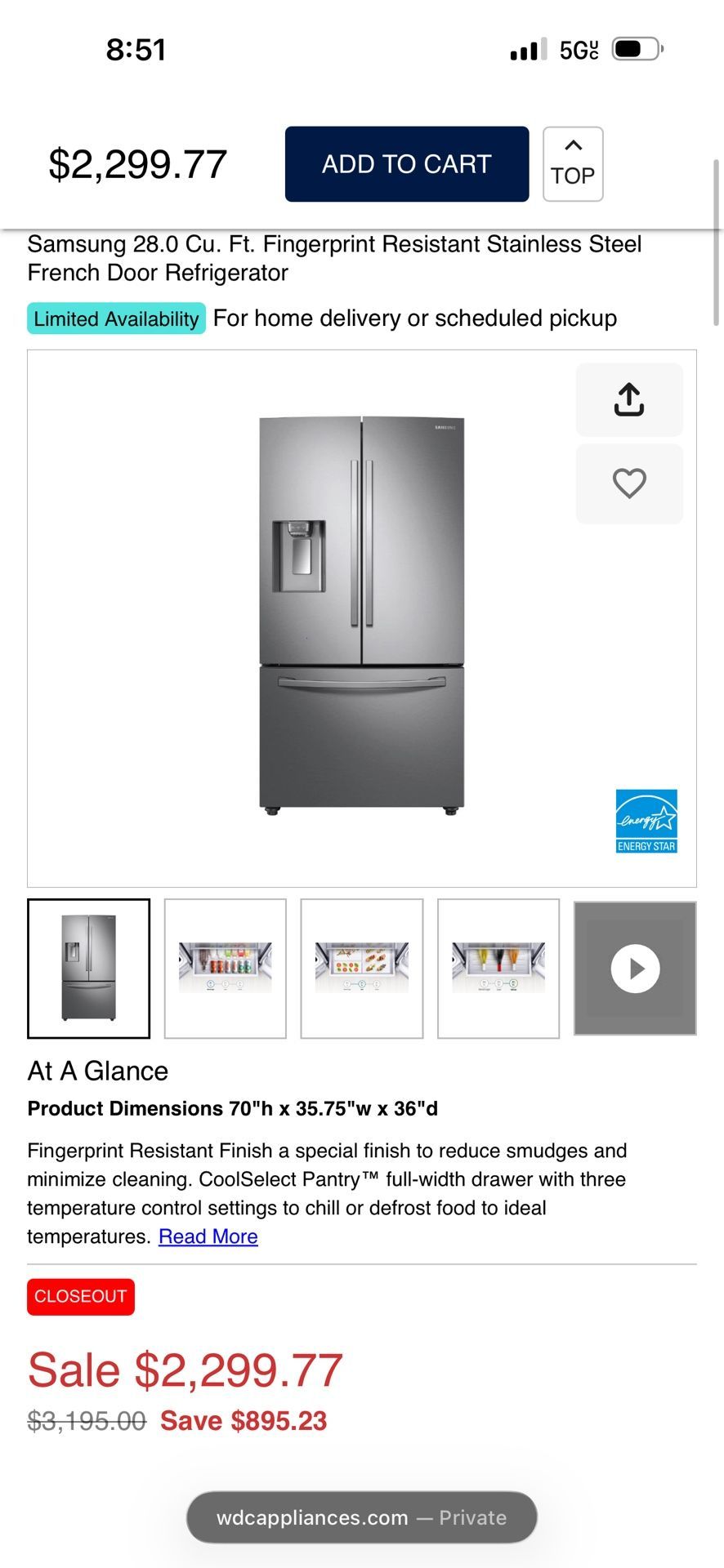 Samsung French door smart refrigerator New. We took it out of the box because it was to big and didn’t fit in my truck. Brand new