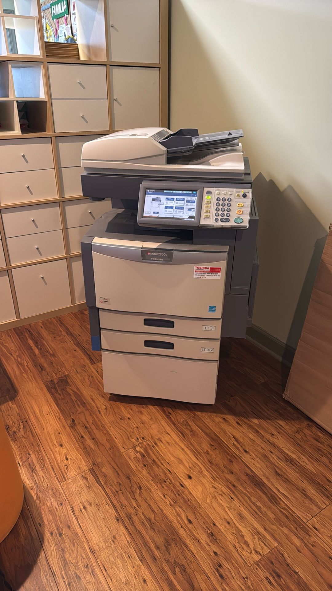 Hi! We are getting ready to move and won’t be taking this copying machine with us so hoping it goes to someone who can use it. It includes: - letter size, legal size plus special A3 A4 size sensors which suitable for both North American and Europe standard (handles large paper sizes!) - Built-in base cabinet for storage - No subscription or contract with Toshiba - fully paid off - A big box of brand-new, sealed Toshiba toners (blue, red, yellow) Perfect for someone who knows office printers, a home business, or anyone who just wants a good deal on the machine and lots of toner. Pickup only. It’s heavy. Please bring help.