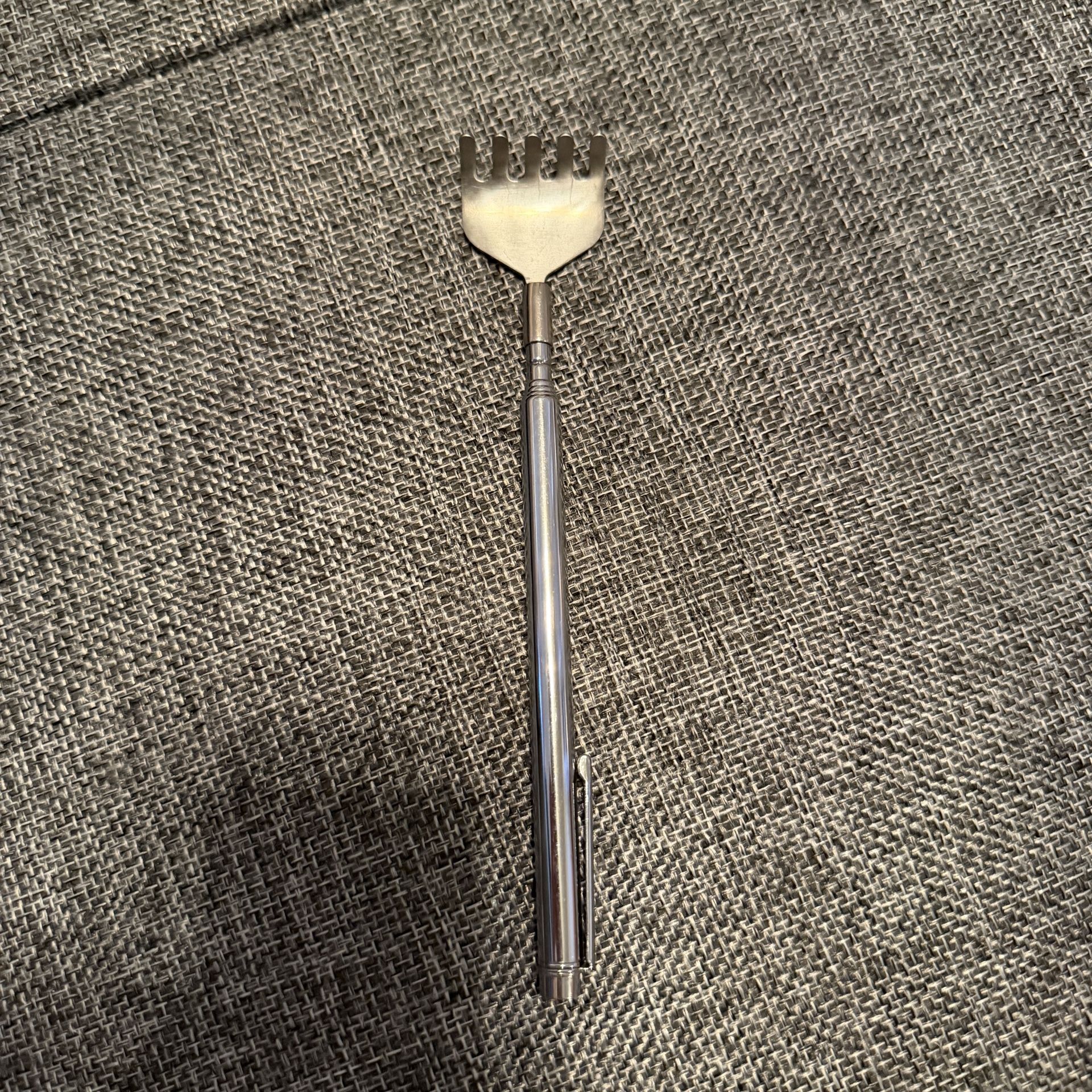 Silver telescopic back scratcher with a metal handle. Compact and portable design.