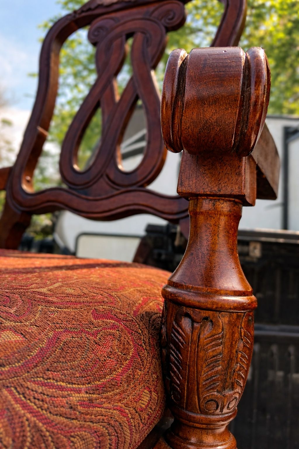 Beautiful armchair. This North Shore dining chair is discontinued. Has dark brown wood with cool carved back and arms. Comfy patterned seat in red and orange tones. Dimensions are 26.13W x 44.38H x 24.75D. Weighs 16.5 lbs.