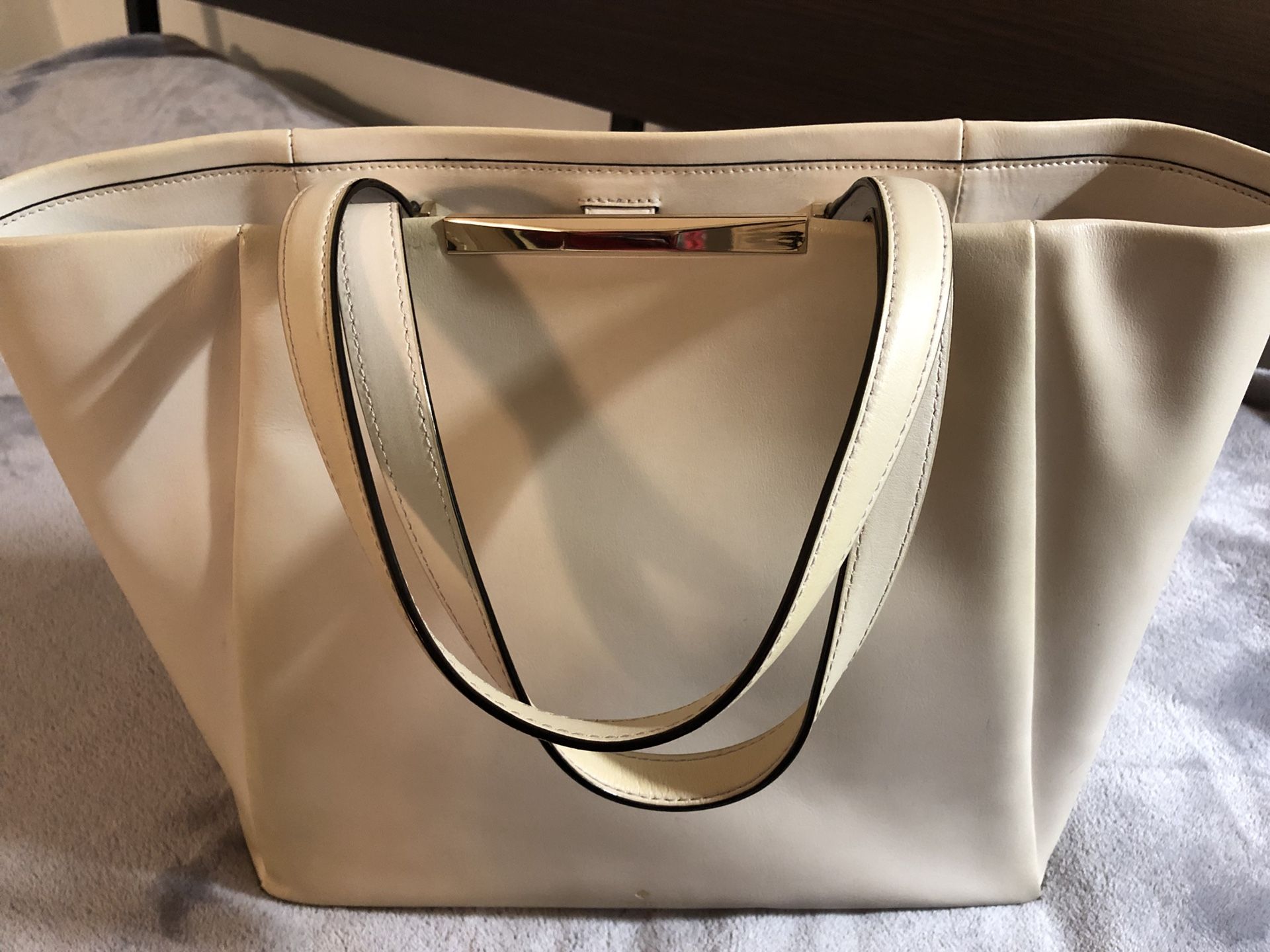 Very cute cream color tote from Kate Spade. Used for a few months. There is a small pink scratch on the front as shown on the last photo. A little yellowish colors on the edges, inside zip pocket has some black marks from my eyeliner, but if you can just get this cleaned, it’ll be totally fine. That’s why i’m giving it at this price.