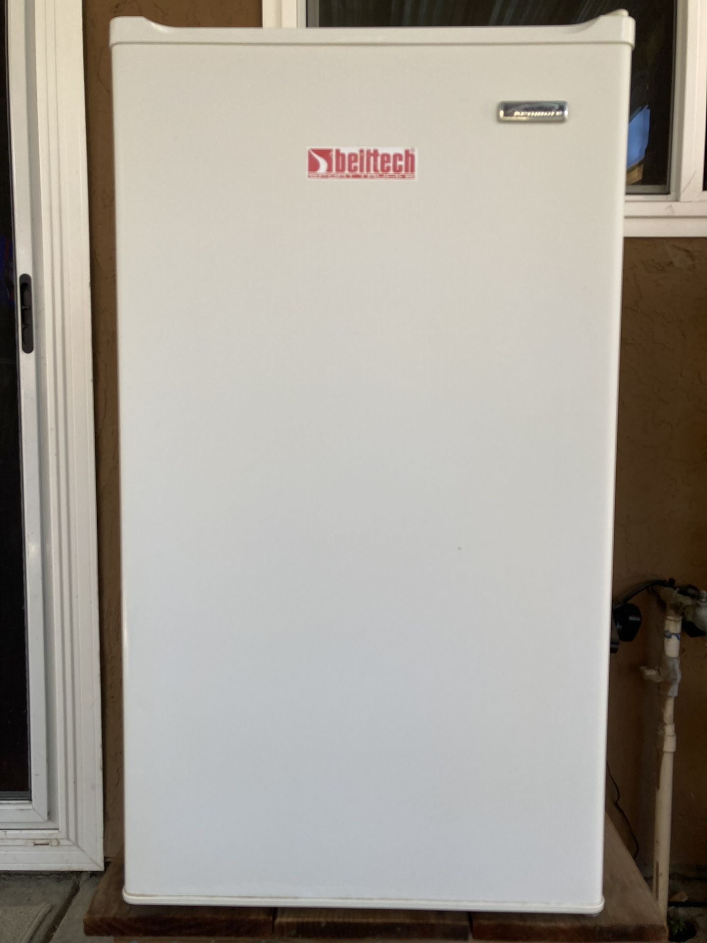 Kenmore 3.9 cubic foot compact refrigerator. Is approximately 19” wide by 19” deep by 34” tall. Still works great, I plugged it in this morning and it’s icy cold already. Adjustable shelves, separate freezer section. Has a few dents but works great.