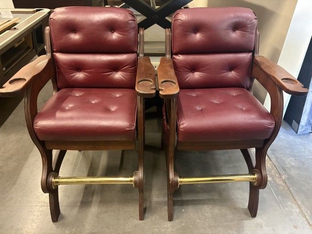 The finest gameroom chairs produced in a medium brown finish with burgundy vinyl cushions! Articulating seat for extra comfort and brass bar foot rest! Sold as a pair! We are Sure Shot Billiards and specialize in quality preowned pool tables, shuffleboards, arcades, game room furniture and accessories. and install every table we sell professionally with all the accessories you need to get playing and accept cash,heck or card. Come see our inventory in person at our showroom! We are open all day Saturday and Monday 9:30 -3:30. Please to make an appointment for any other times during the week. Professional setup and is $350.