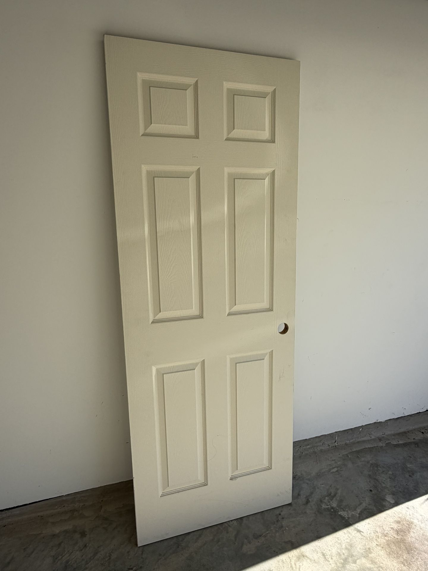 Interior 6-panel door slab in good condition. Clean white/off-white finish and classic style that works well for bedrooms, bathrooms, or closets. Pre-drilled for standard door knob and latch. Door is solid and straight with only light cosmetic wear from prior use and storage (see photos). No cracks or structural issues. Details: • 6-panel interior door • Painted white / off-white • Slab only (no frame or hinges) • Standard knob and latch holes already cut • Right-hand swing (based on existing bore) Great option for a replacement door, remodel, rental property, or DIY project. Local pickup only. Cash preferred.